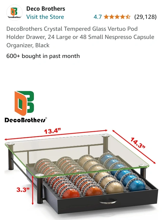 Glass and black metal pod holder, it holds 24 large or 48 small Nespresso Vertuo pods.