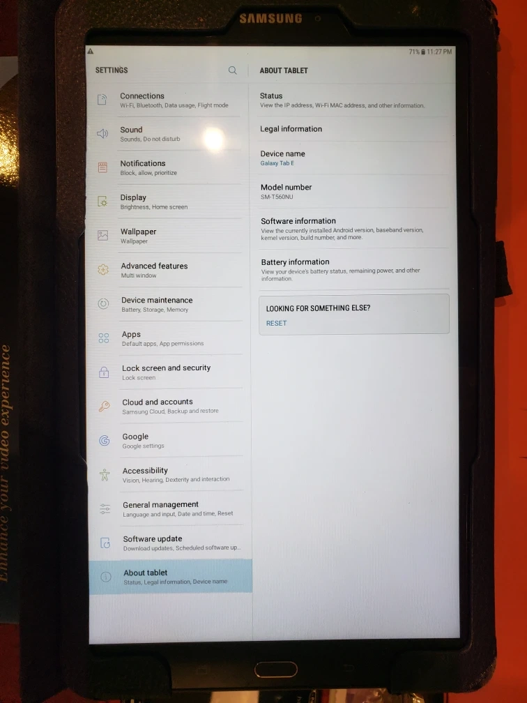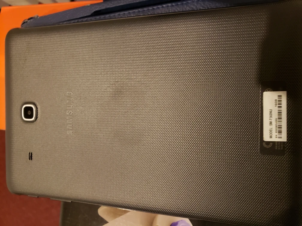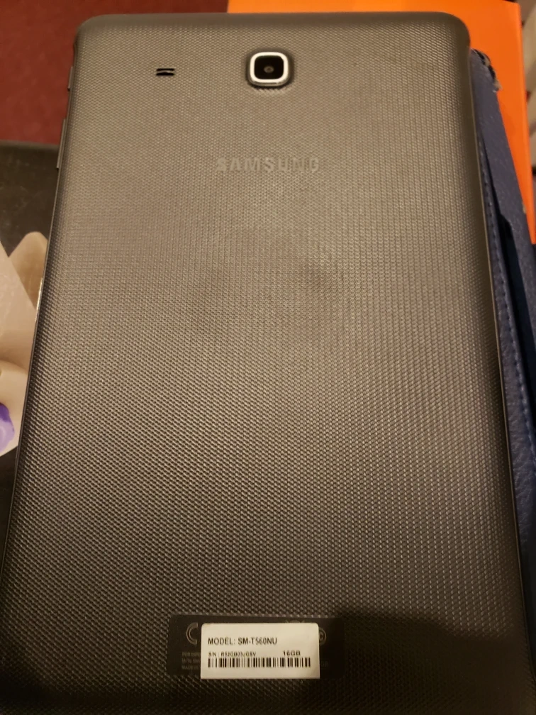 Great condition. No scratches. Comes in blue folio case and original Samsung Galaxy Tab E box.