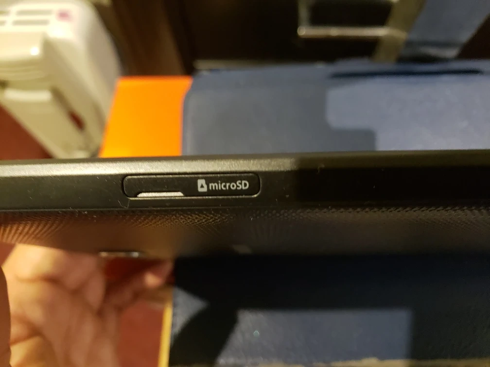 Black Samsung Galaxy Tab E tablet. 9.5 inch display. Micro SD card slot.