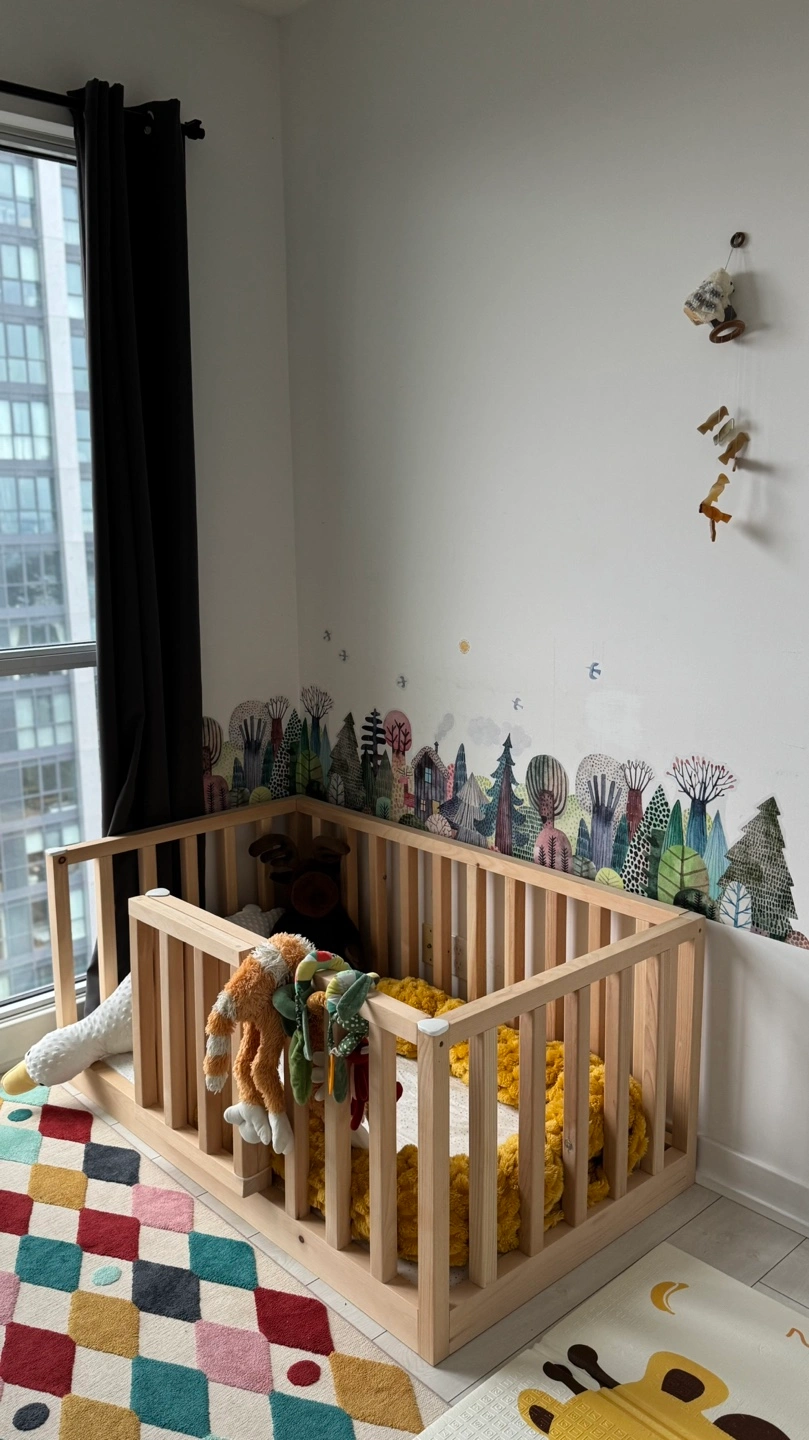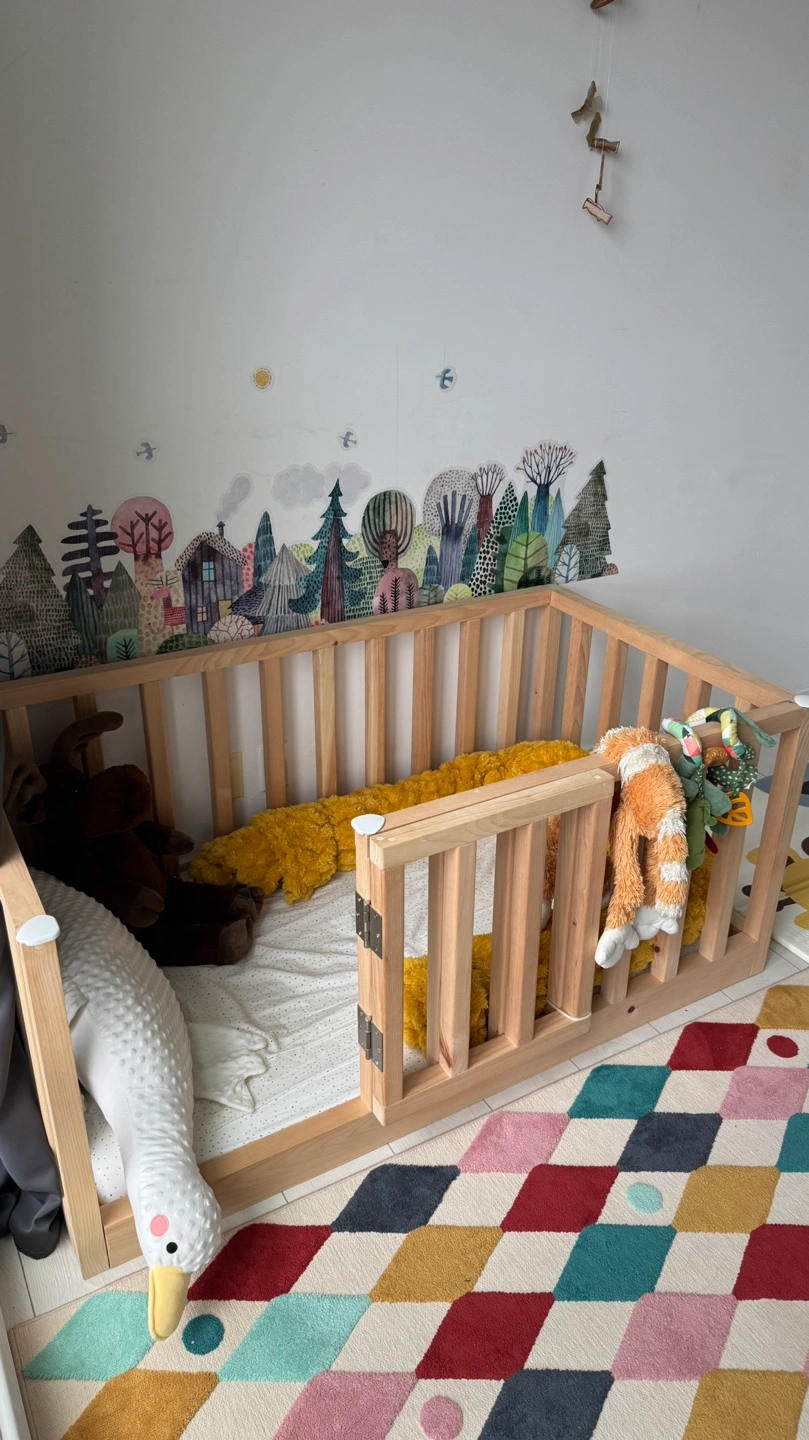 Custom made of natural pine wood a Montessori style floor bed in crib size (27.5x52 inches and 24 inches high) ๐๏ธ