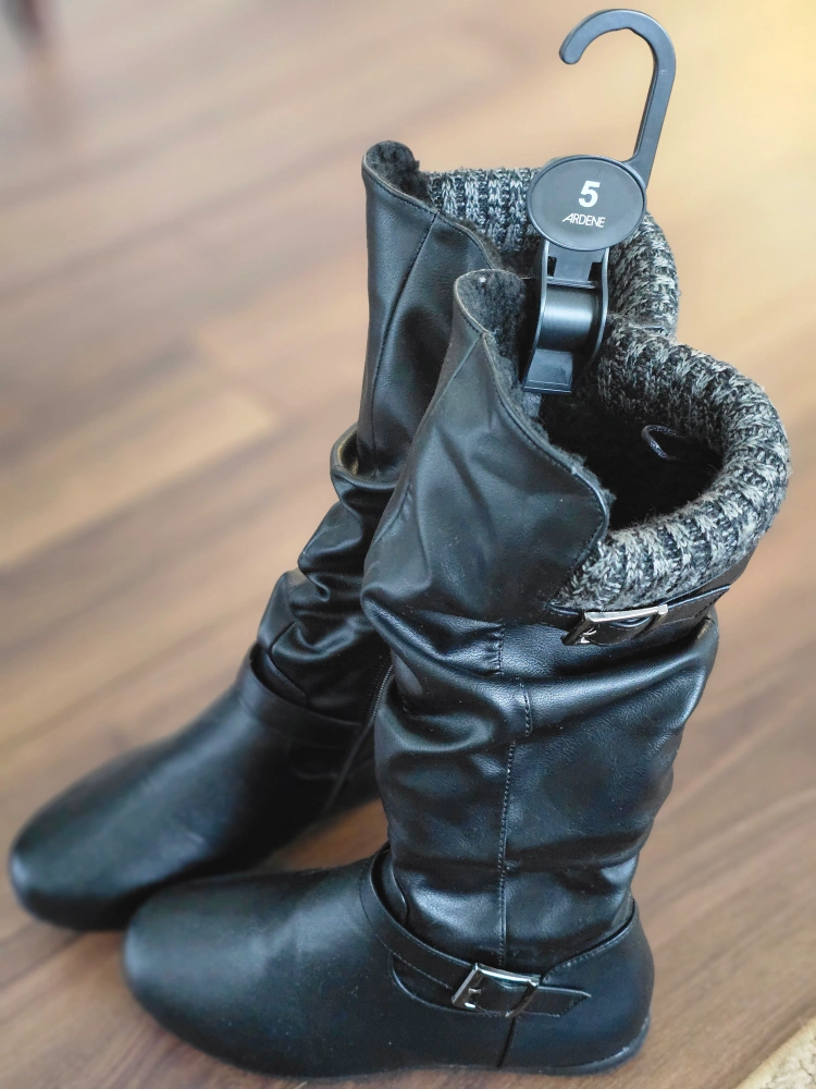 Black knee-high boots with a buckle detail and a zipper on the inside of the leg. The boots have a warm fleece lining.