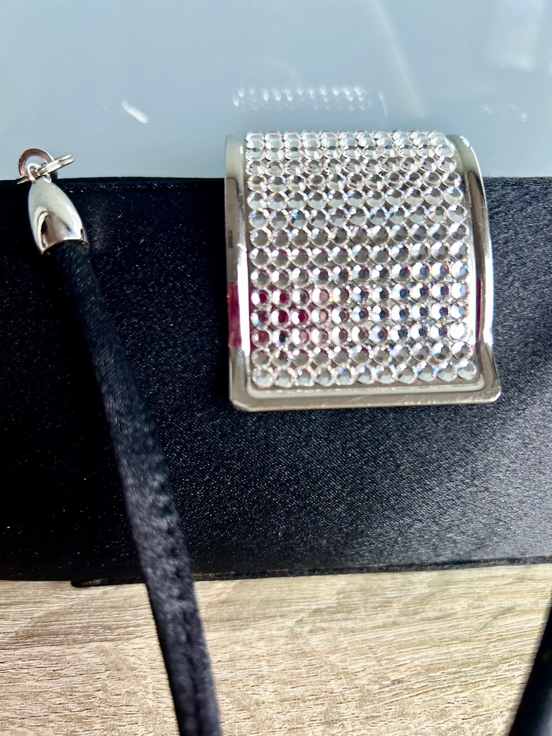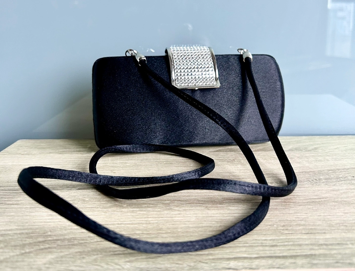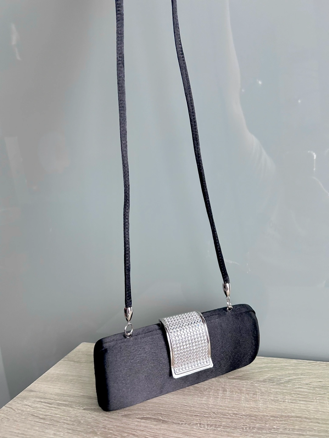This timeless elegant black satin evening clutch features stunning crystals and an optional cross body strap! π