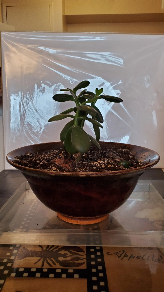 Green, healthy jade plant in a brown pot. Small size, good for a desk or shelf.