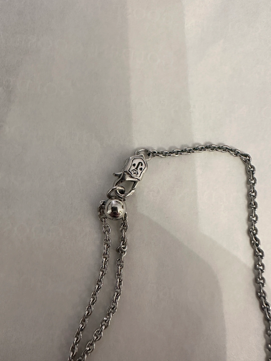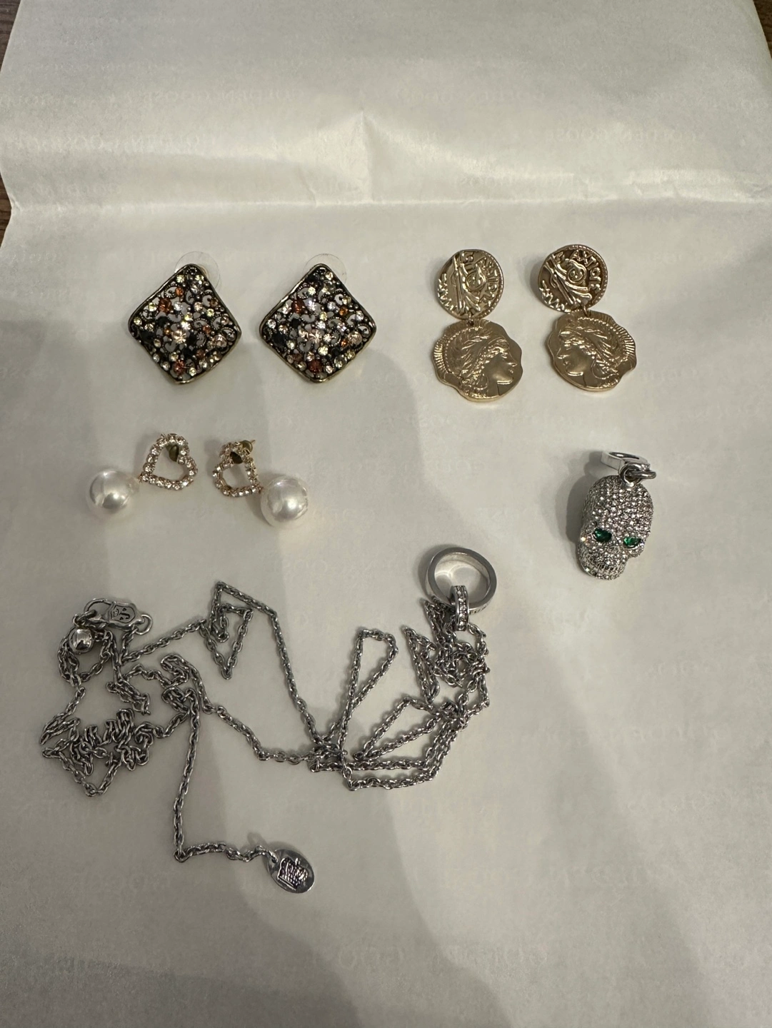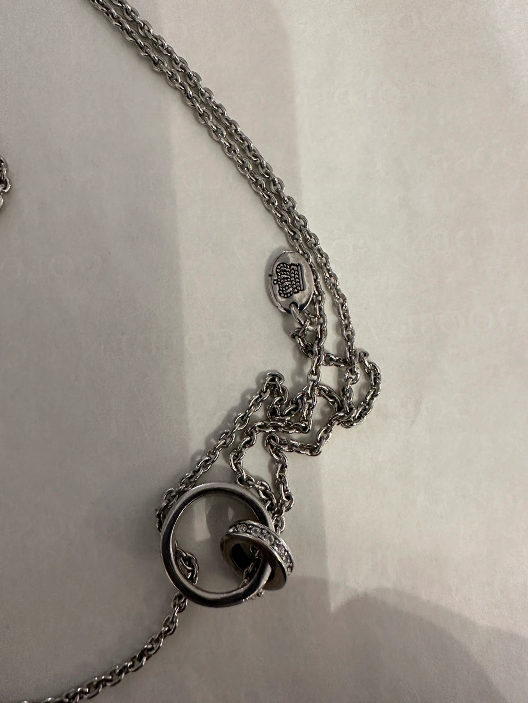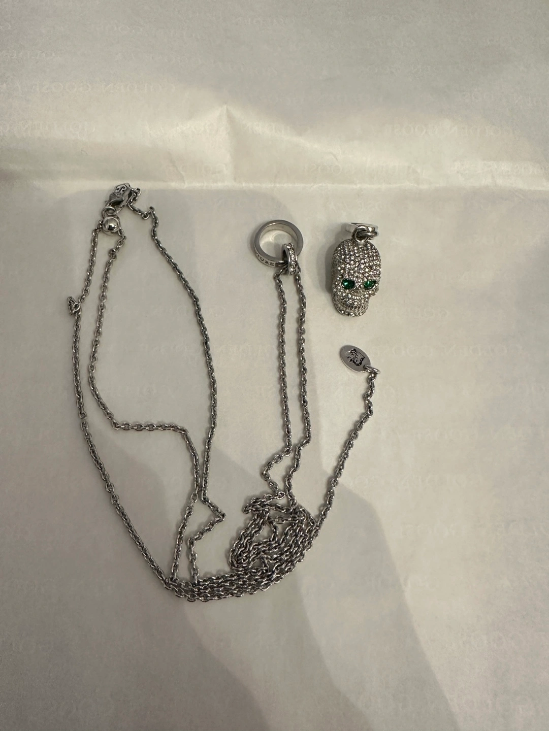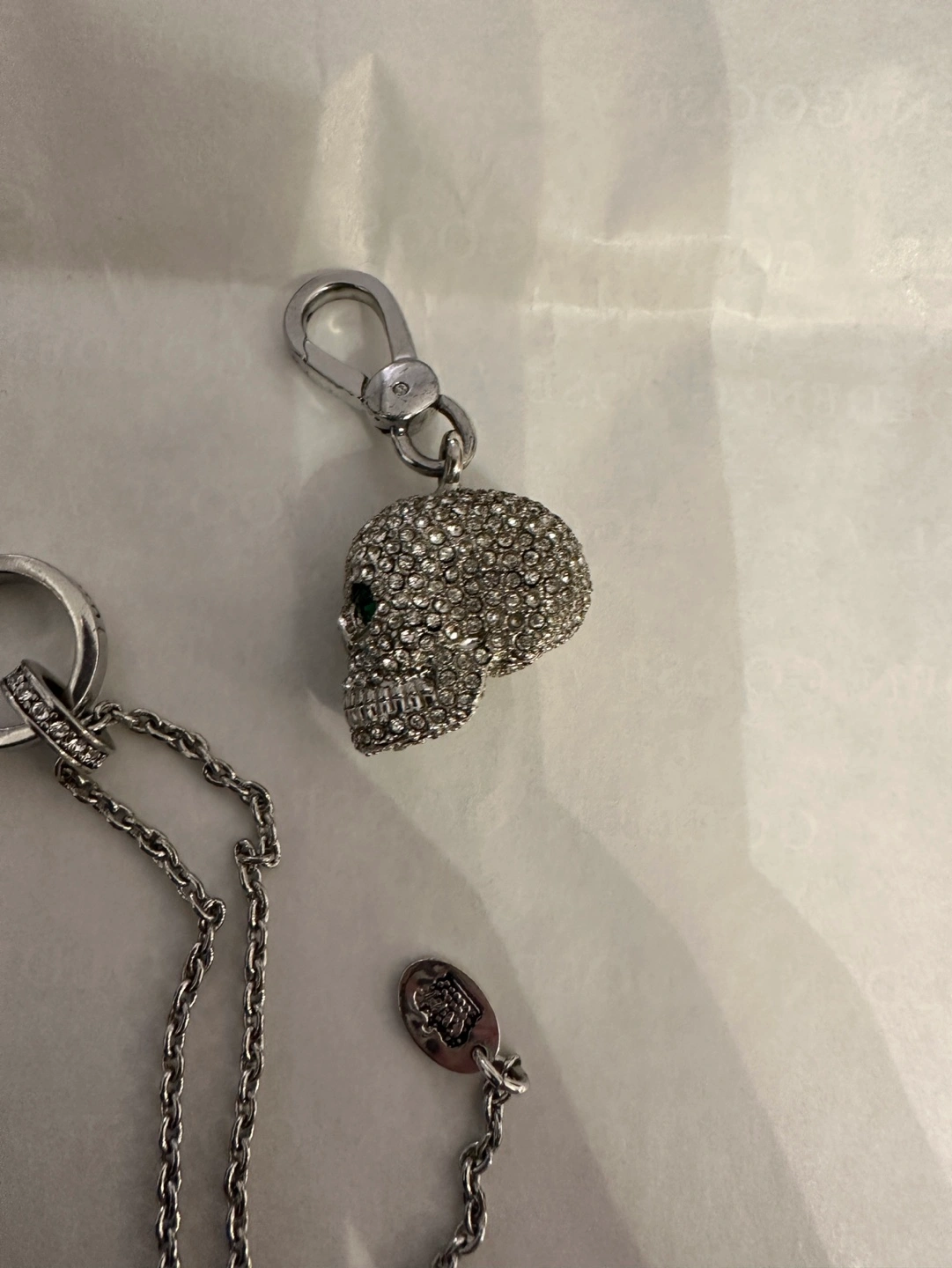 -A silver chain necklace with a skull charm( Juicy Couture), the chain is adjustable. There are a couple of crystals missing on the skull charm.