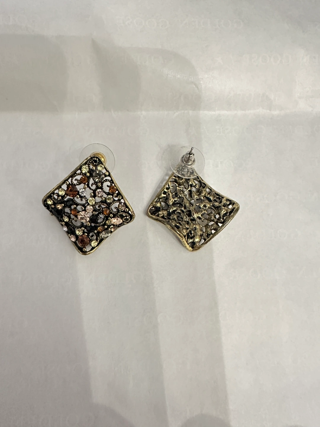 -one pair of gold square earrings with rhinestones/no brand
