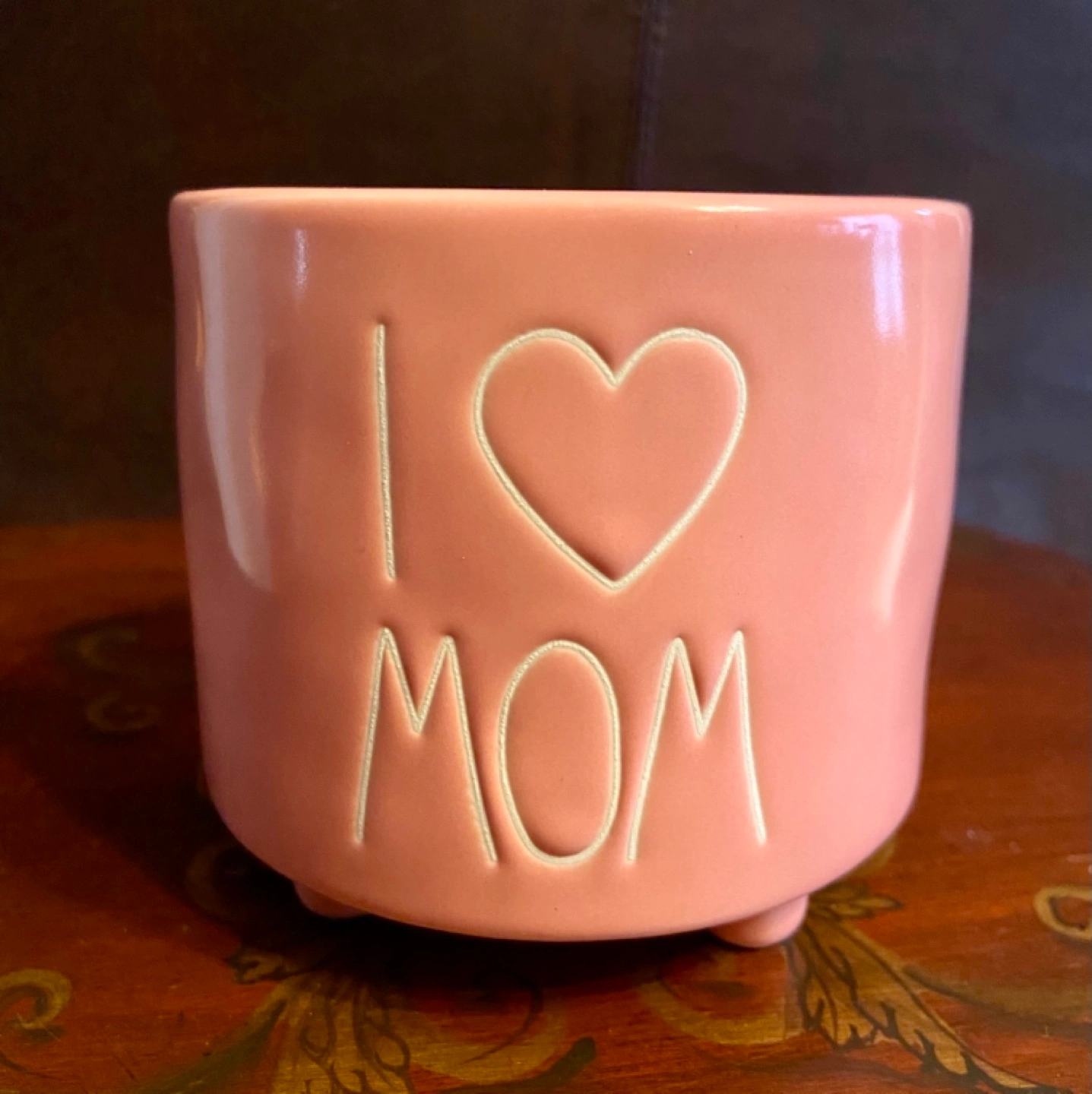 Pink planter with white lettering that reads 'I Love Mom'. It has three small feet on the bottom. Was never used.
