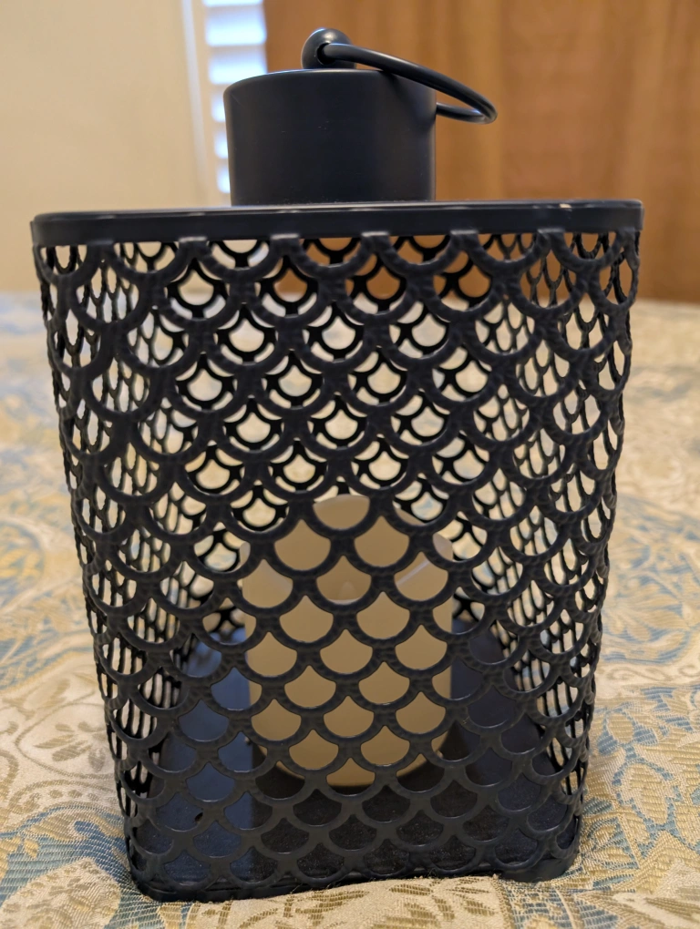 Square metal lantern with a handle, decorative black metal design, and a battery operated light. Hampton Bay Designer - 3 Lamps x 10 = $30.00