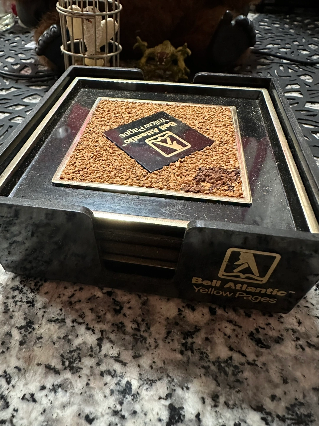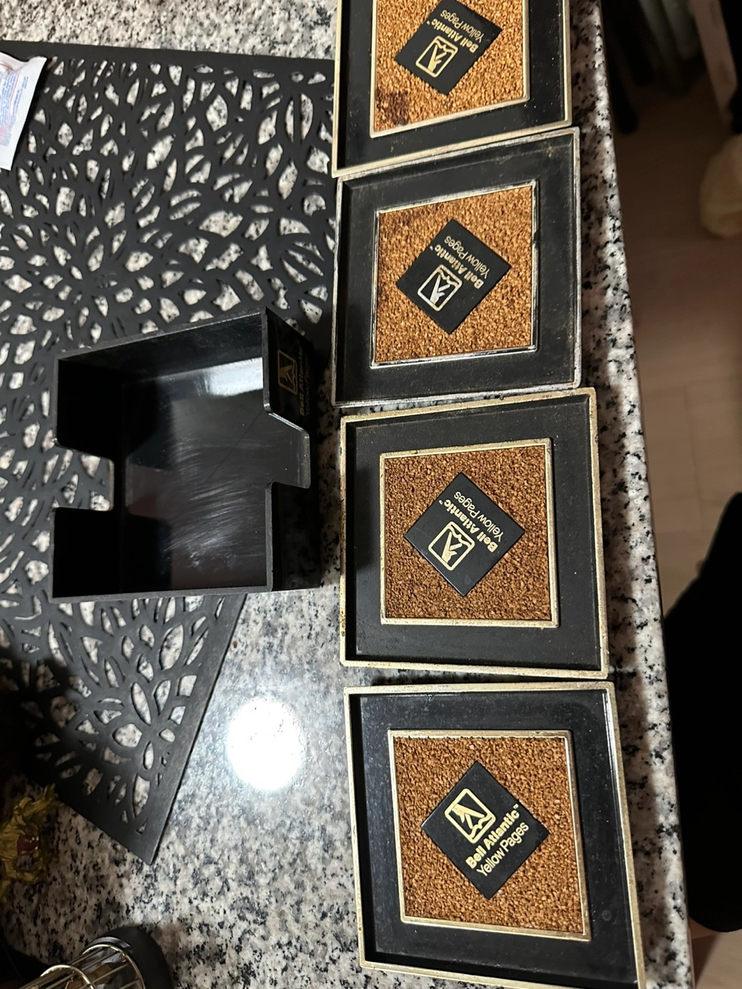 Set of 4 vintage BELL ATLANTIC YELLOW PAGES coasters with holder. Cork-backed and black framed. Includes a small plastic holder for the coasters. Pre-owned
