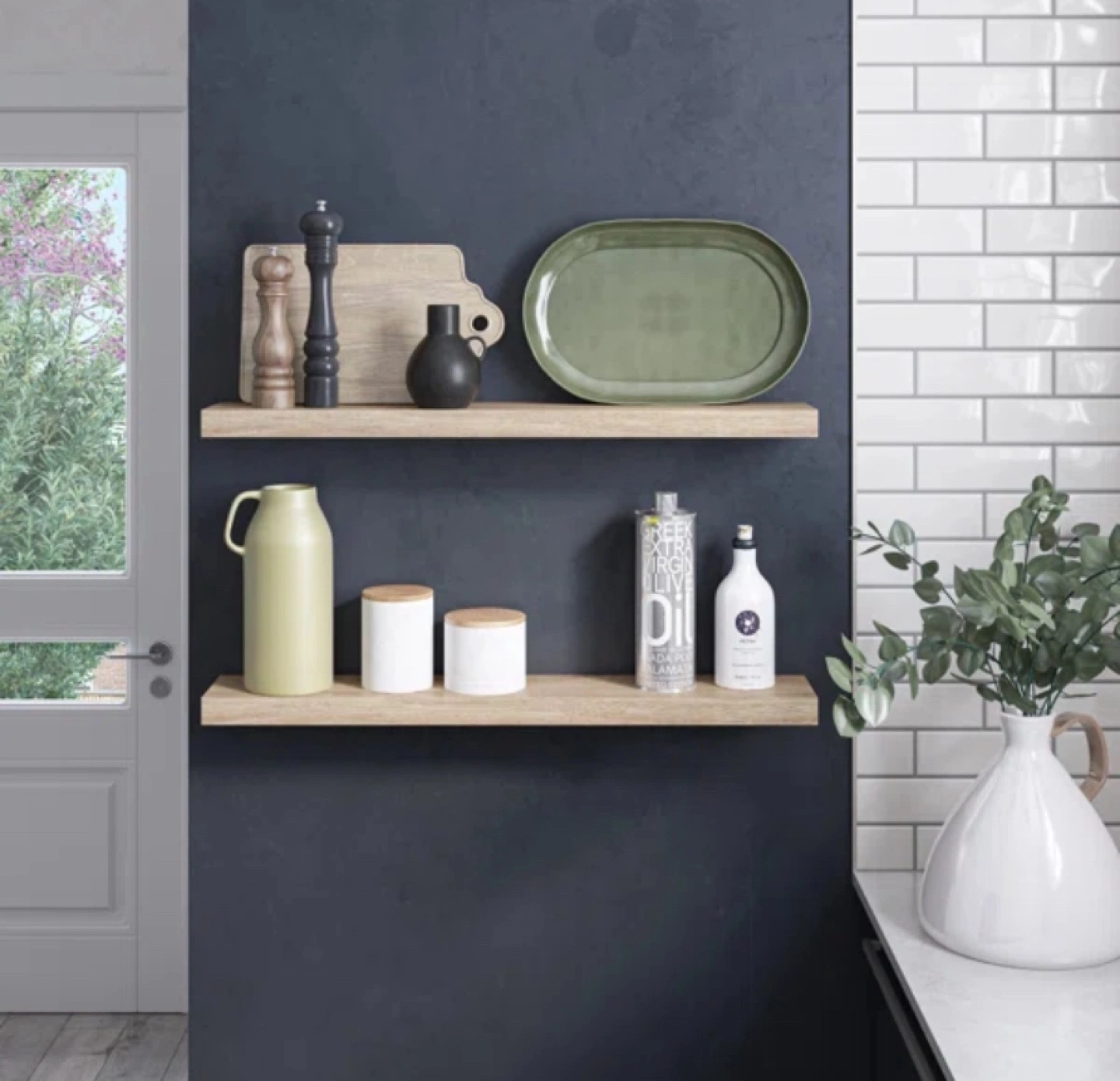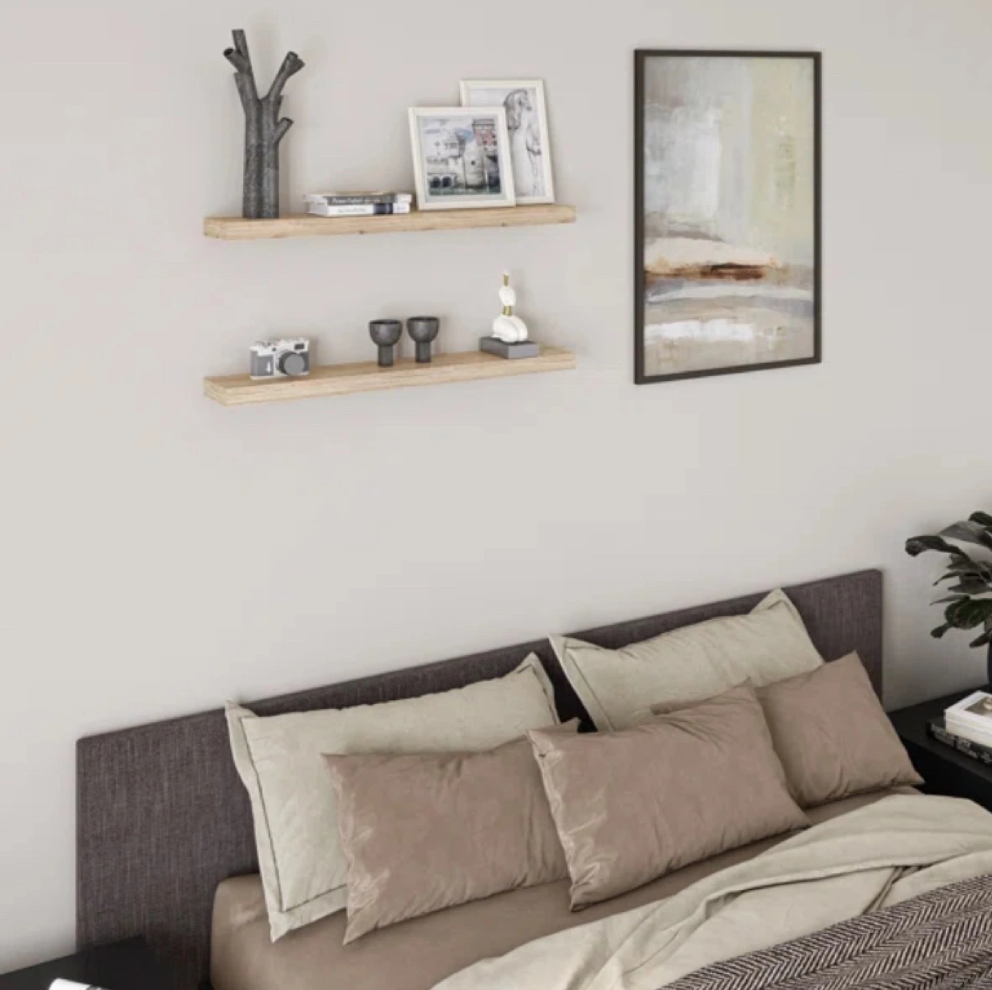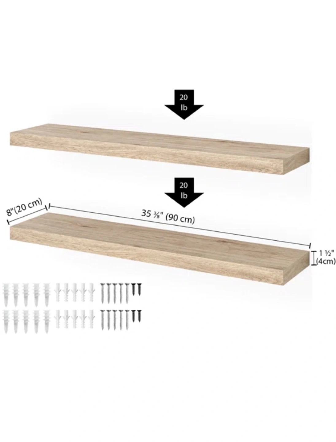 This set includes 2 shelves, each 24" long and 8" deep, to allow you to create an attractive gallery-style wall display in your home. These sleek and stylish extra-deep floating wall shelves not only elevate your décor but will let you make full use of wall storage space and display your favourite items creatively and attractively.