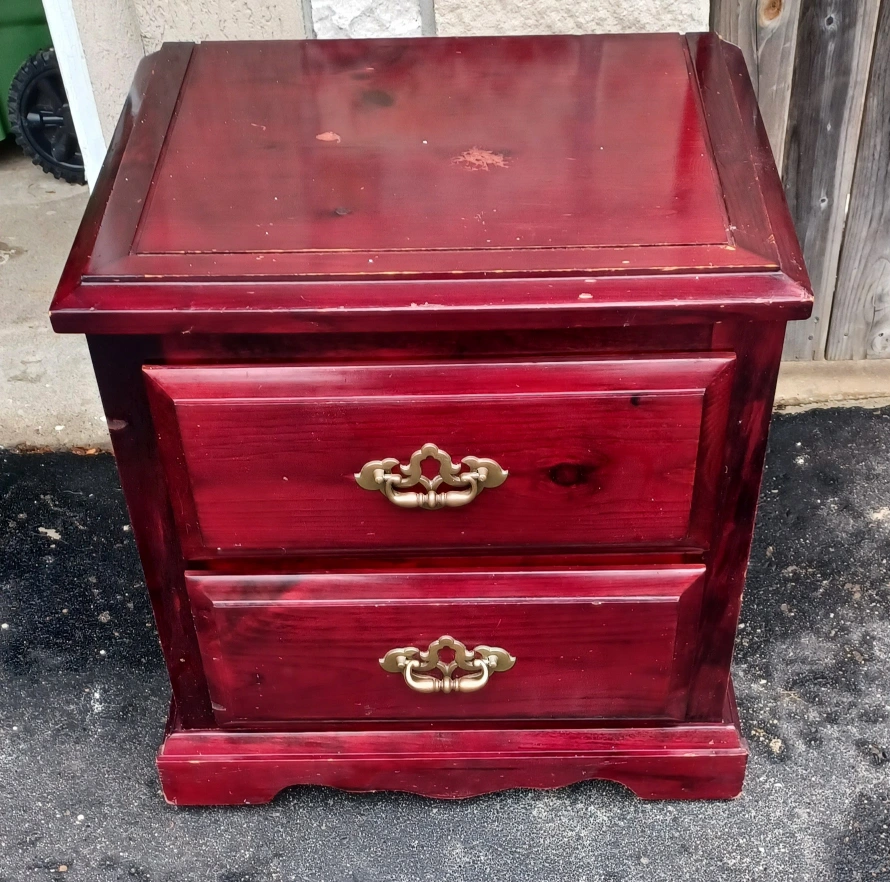 Burgundy wooden nightstand with two drawers and gold-colored hardware. There are minor scratches and wear on the top.
