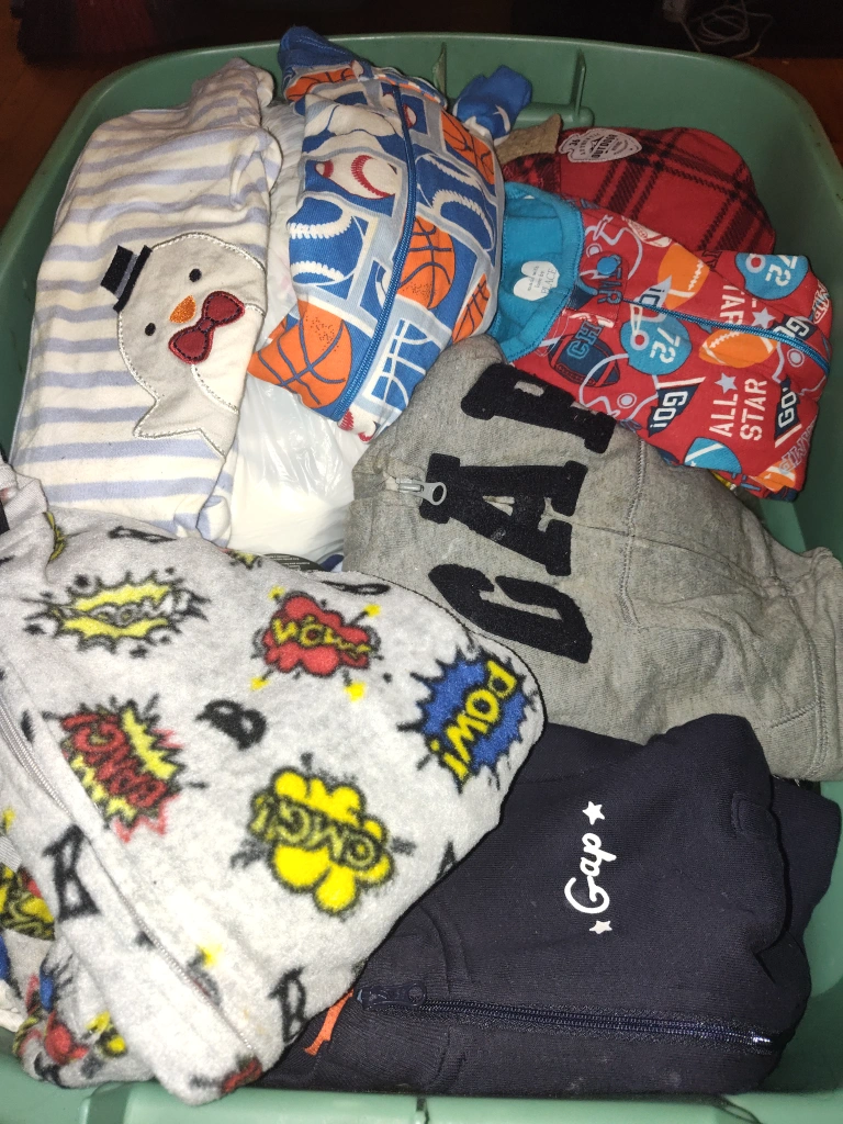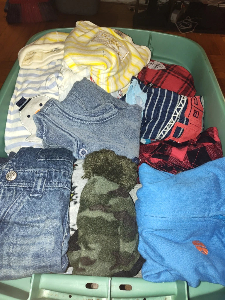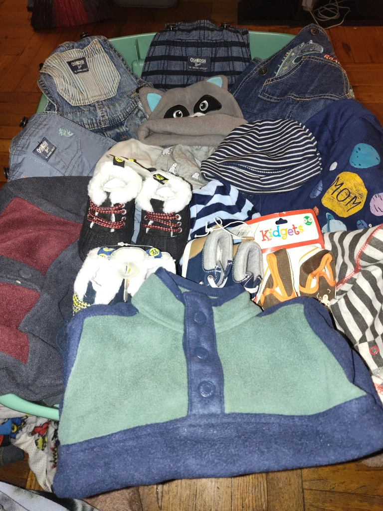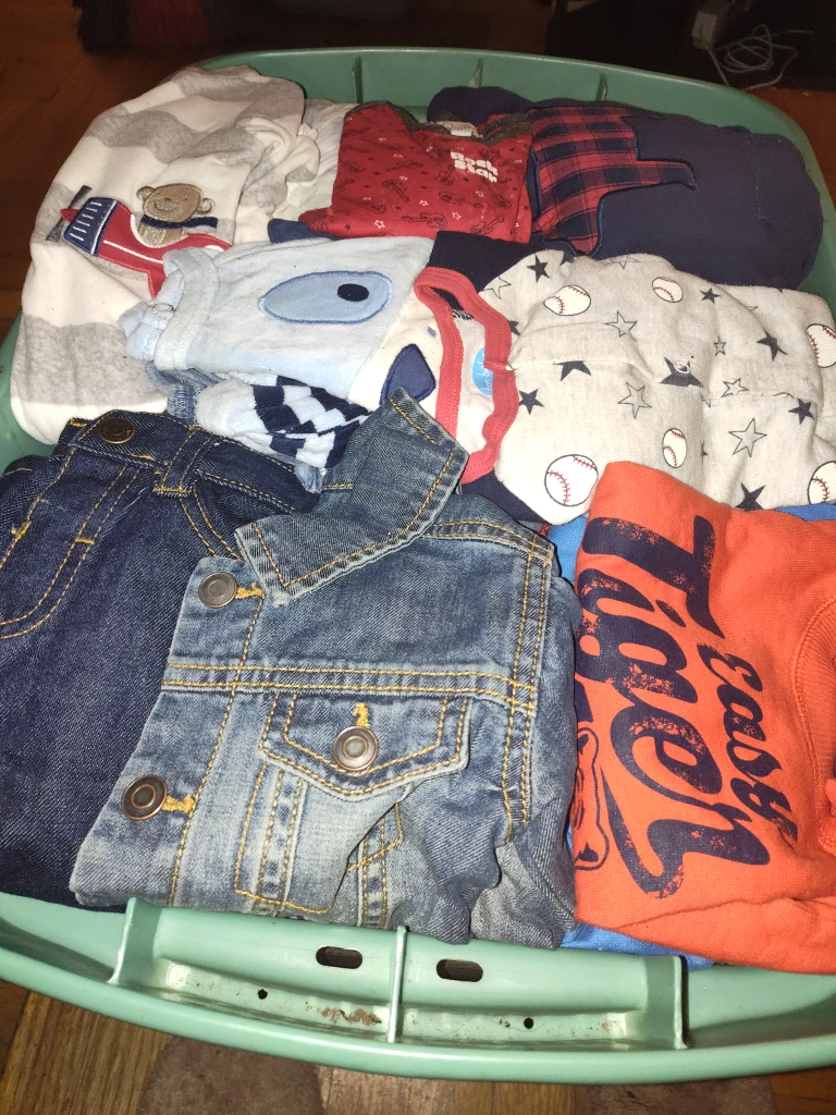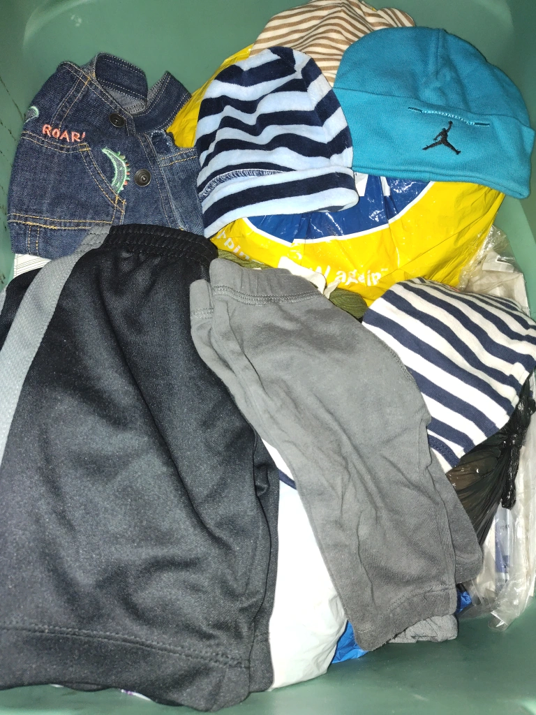 Bundle of baby boy clothes, size 0-3, 6 months ,9 months, 12 months, & 12-18 months. Includes shirts, pants, sweaters, jackets,hats & booties. All items are in good condition.