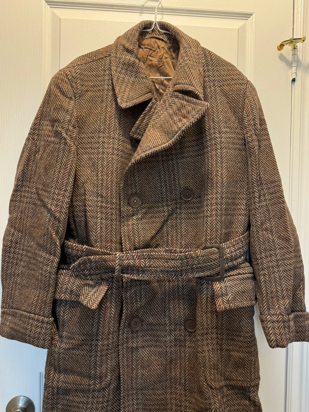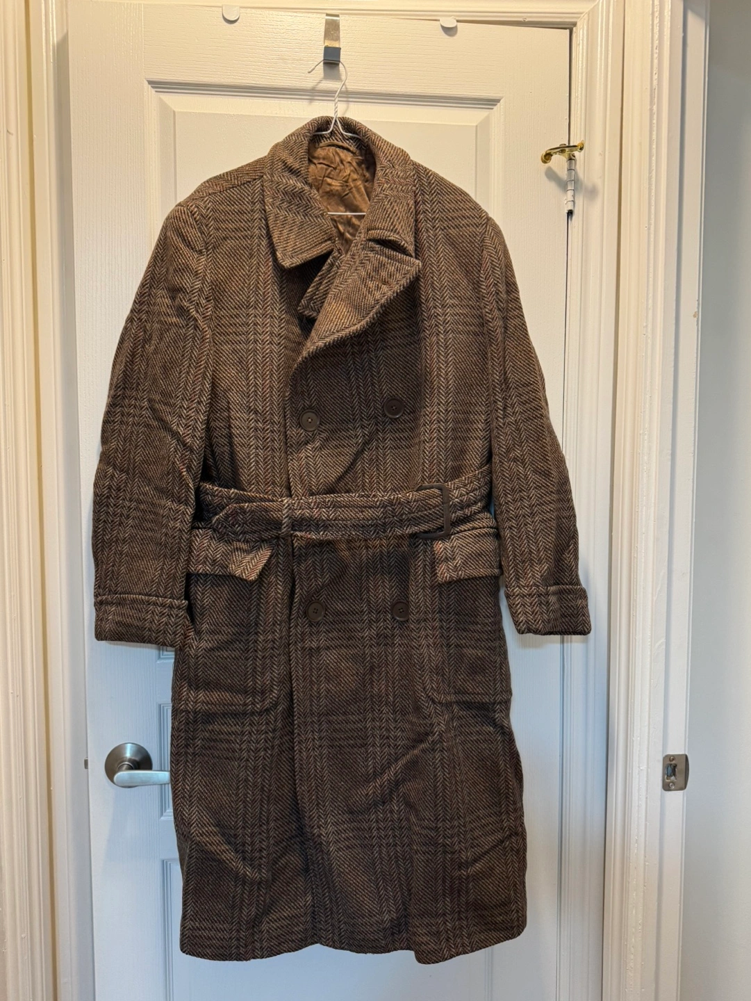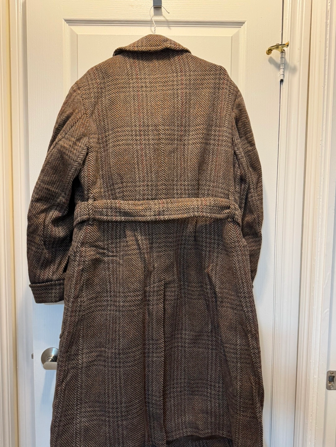 Long, double-breasted wool coat with a belt. Brown and grey plaid pattern. Two flap pockets. Lined. %100 Wool $15 Yonge and Finch area