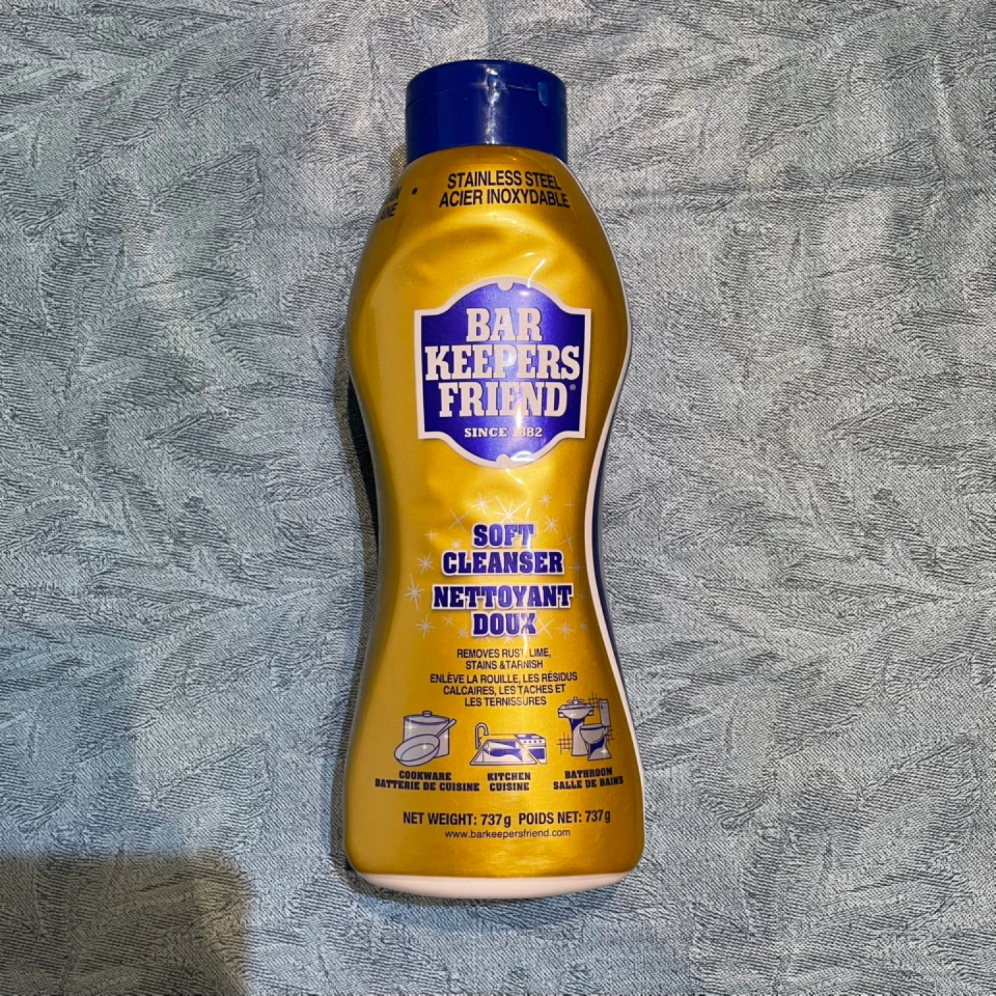 Soft cleanser, removes rust, lime, mineral deposits, calcium, stains, and tarnish. Can be used on cookware, bathroom, and kitchen surfaces. 737g and unopened.