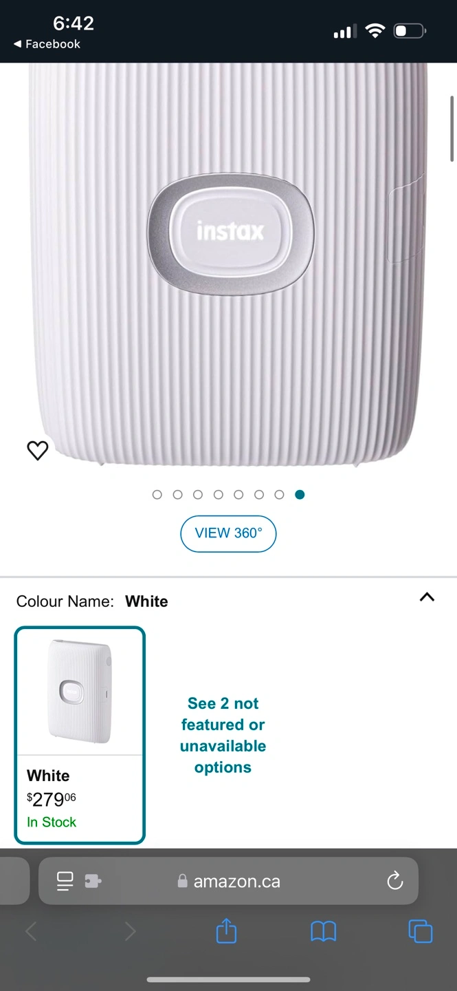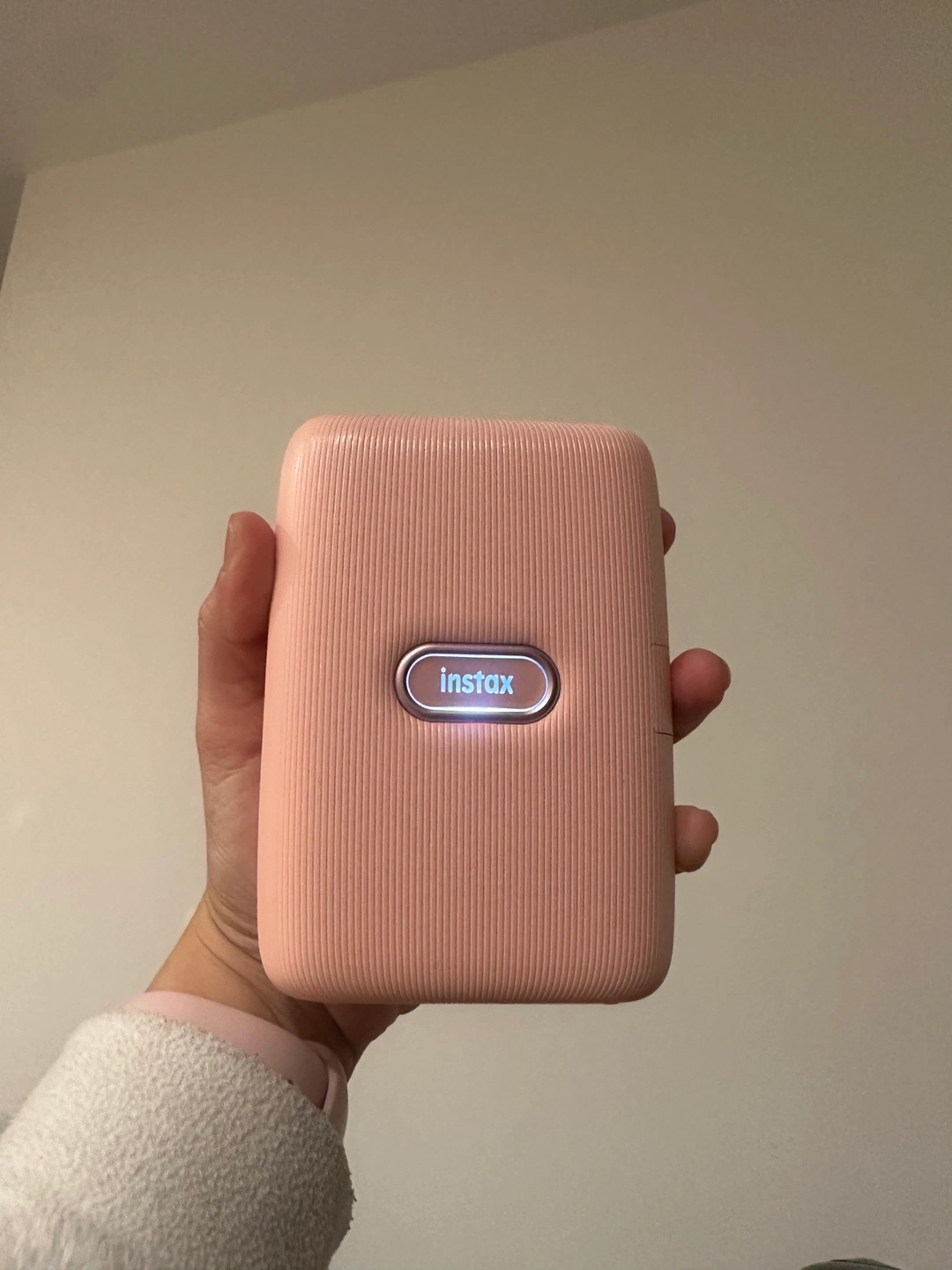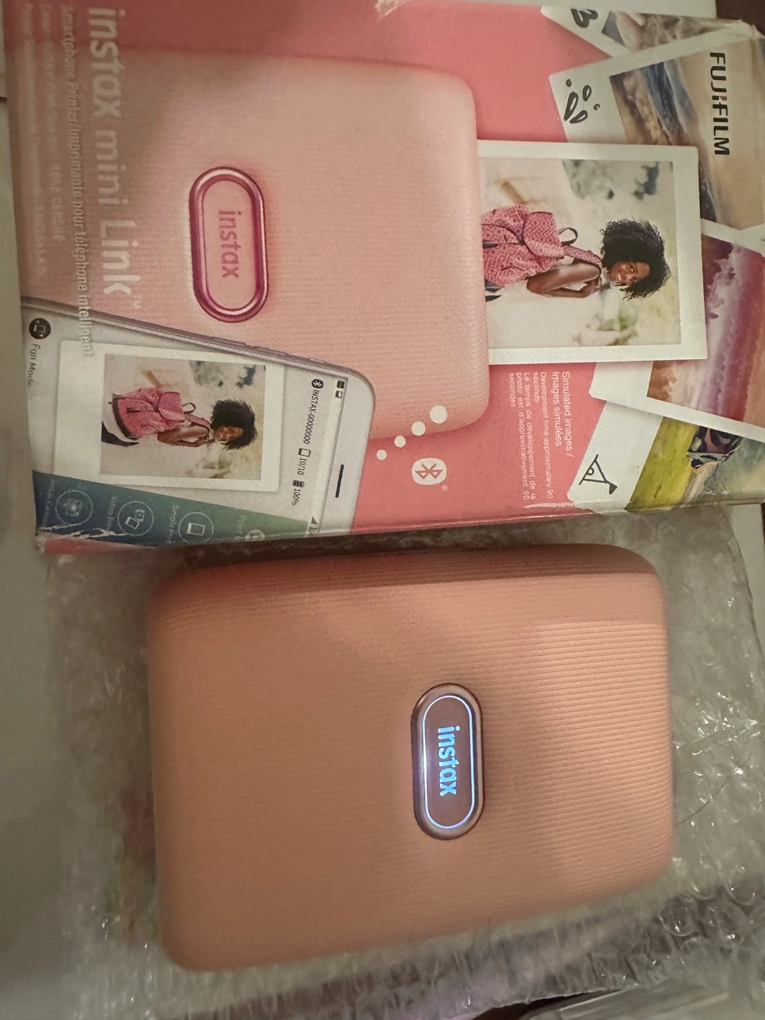 Pink Instax Mini Link printer. Prints photos directly from your phone. Includes a charging cable.