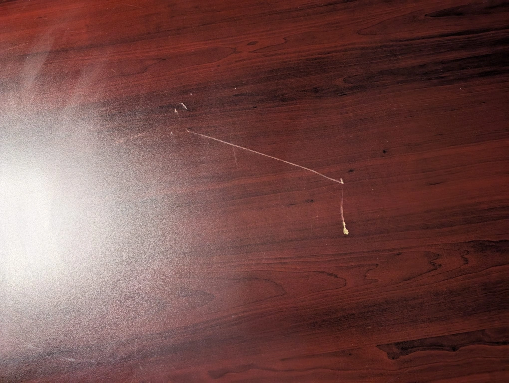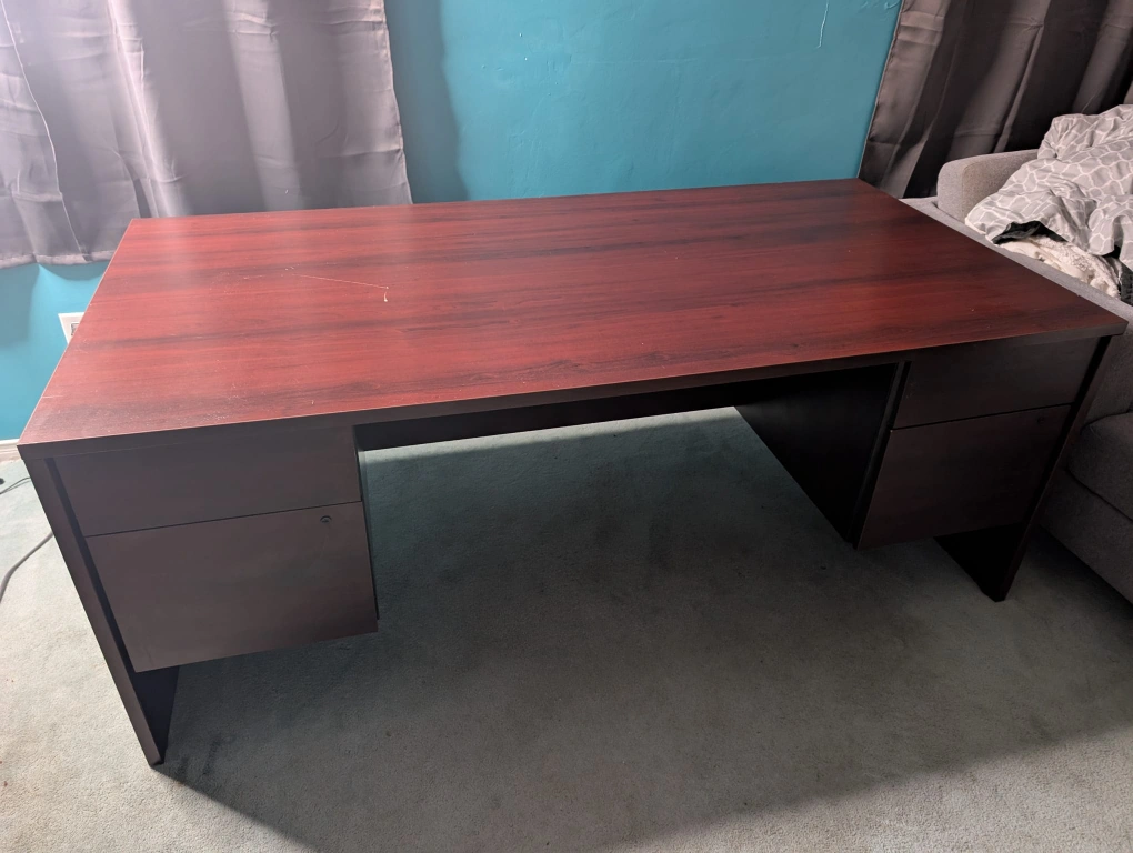 Large brown desk with two drawers. The desk is in good condition, but does have some light scratches and wear. only one major scratch can be fixed and barely noticeable if you're using a mouse pad cover over top. looking to get any offer.