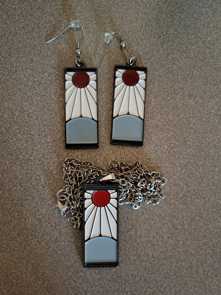 Never worn but unpackaged earrings and necklace with a white and red sun design. Tanjiros signature earrings plus a red sun necklace! perfect if you're a fan of the Demon Slayer anime show!