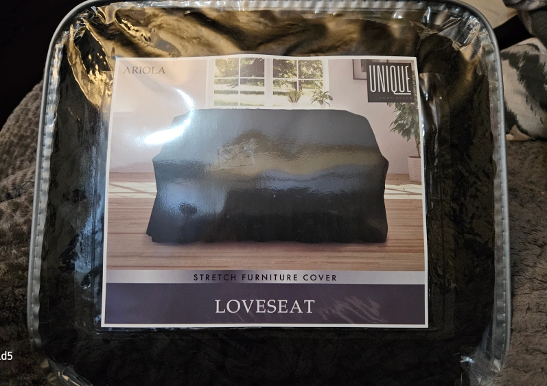 Stretch furniture cover for a loveseat. Four-way stretch fits a variety of chair styles. Water repellent finish, stain resistant, easy on and off, fits most types of furniture styles. Black.