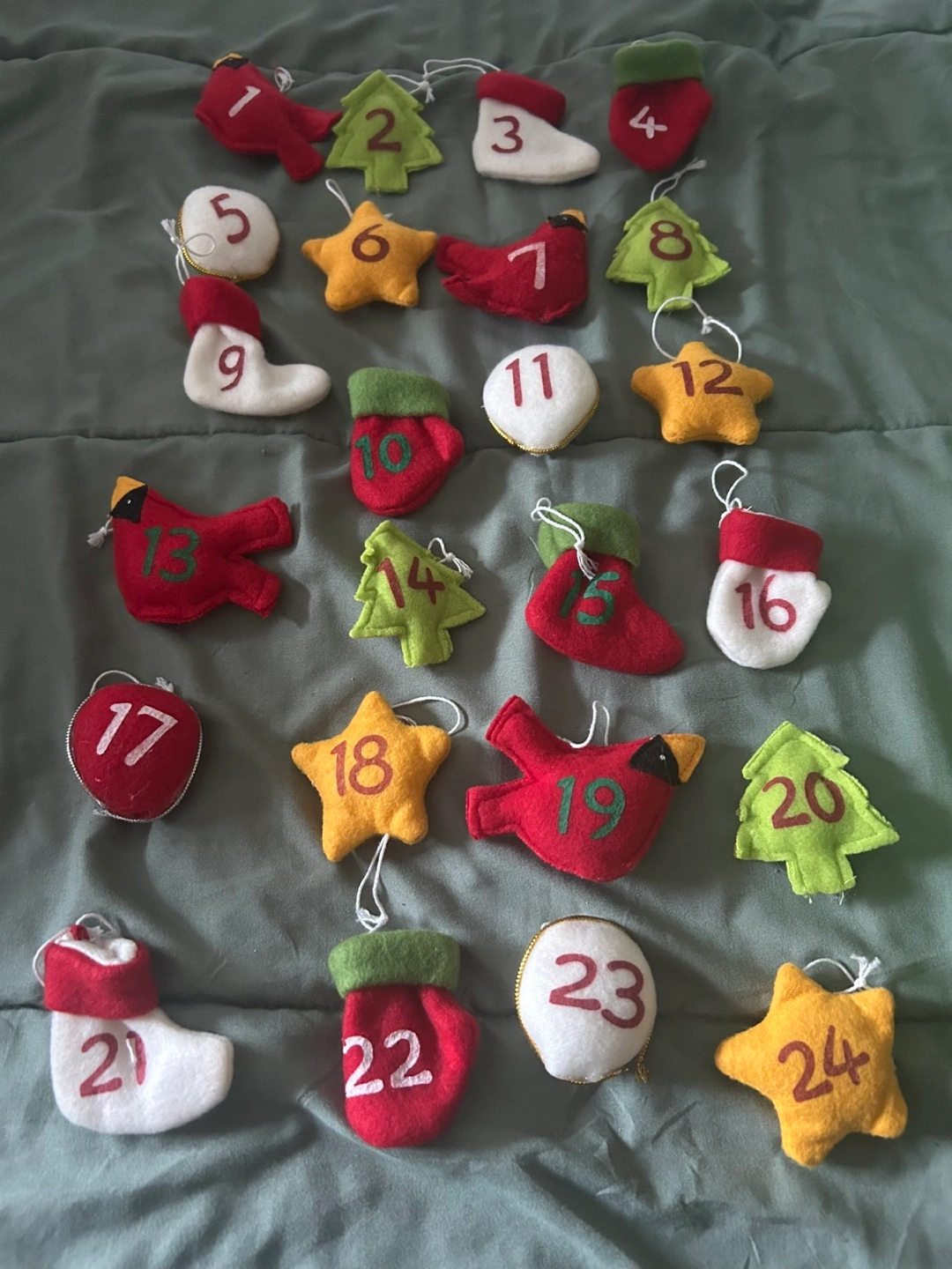 Felt Christmas advent tree with 24 felt ornaments. Numbers 1-24.