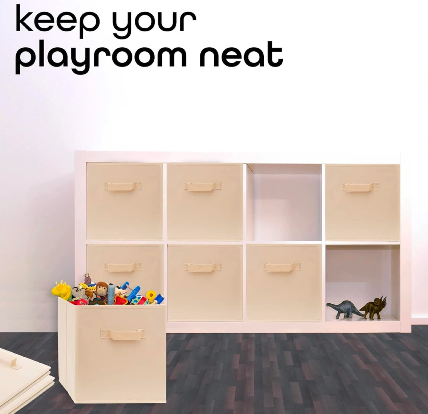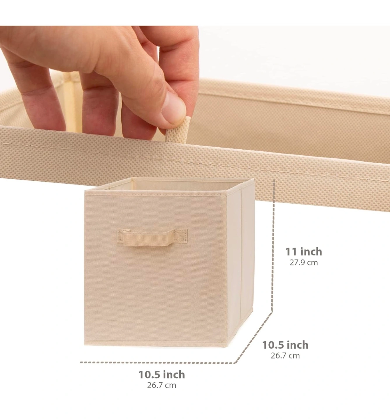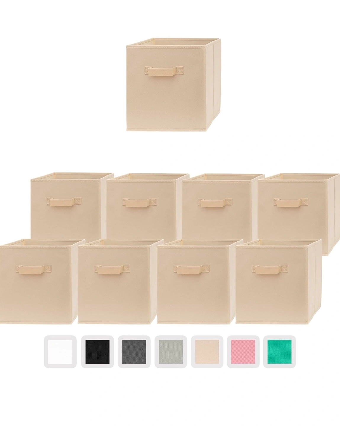 Set of 9beige fabric storage cubes. Collapsible design for easy storage. Great for storing toys, clothes, or other household items.
