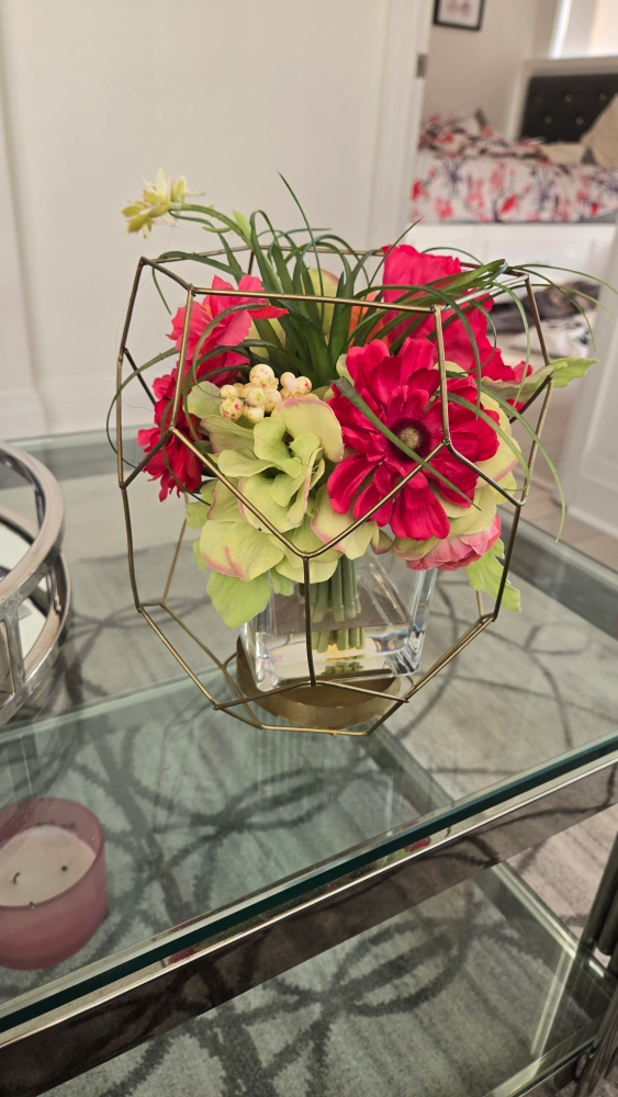 Artificial flower arrangement in a glass vase with a gold geometric cage. The flowers are pink, green, and orange.