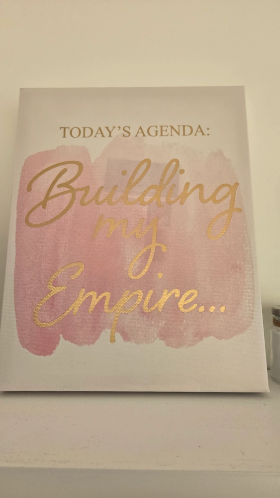 Canvas wall art with pink and gold water colour background and the text Building My Empire.