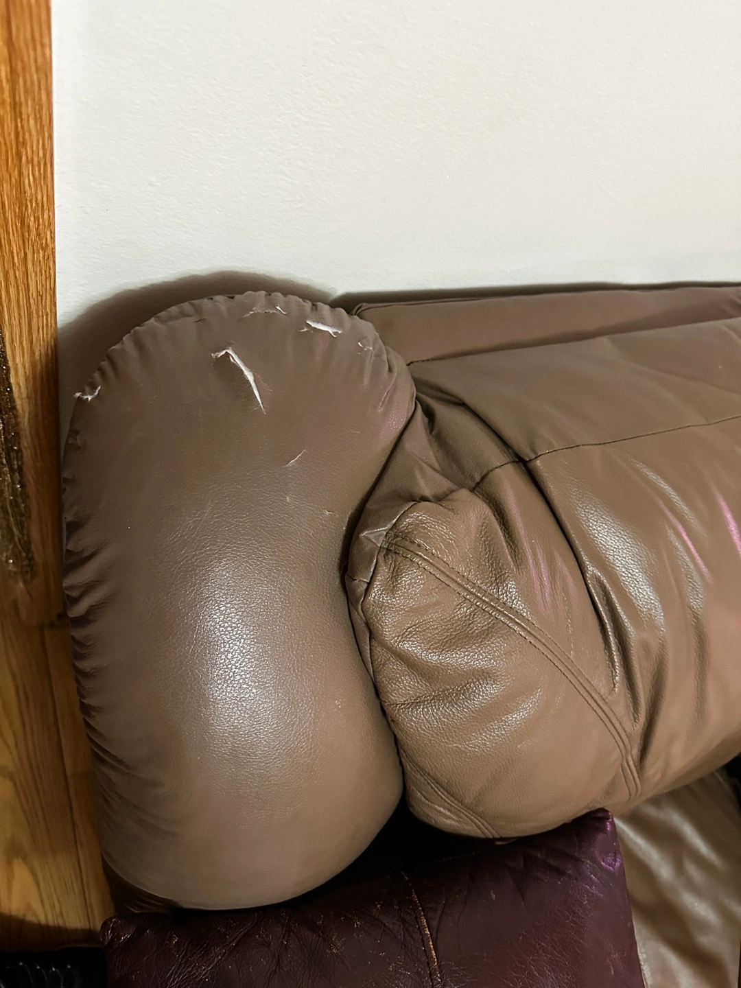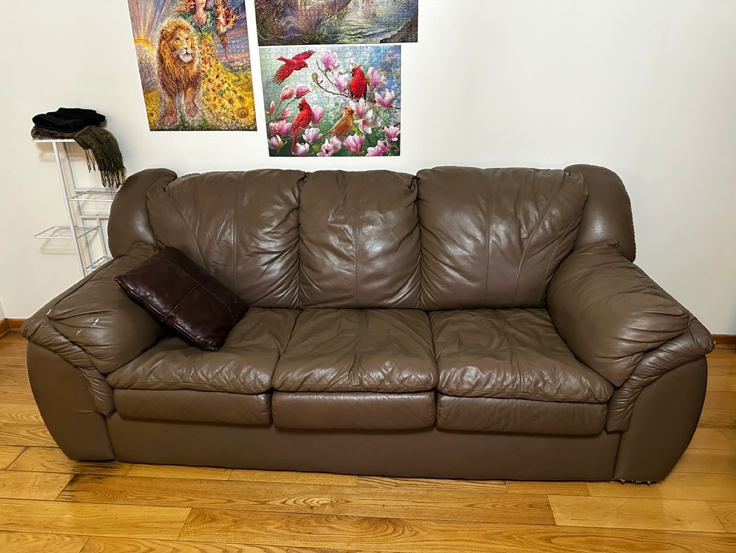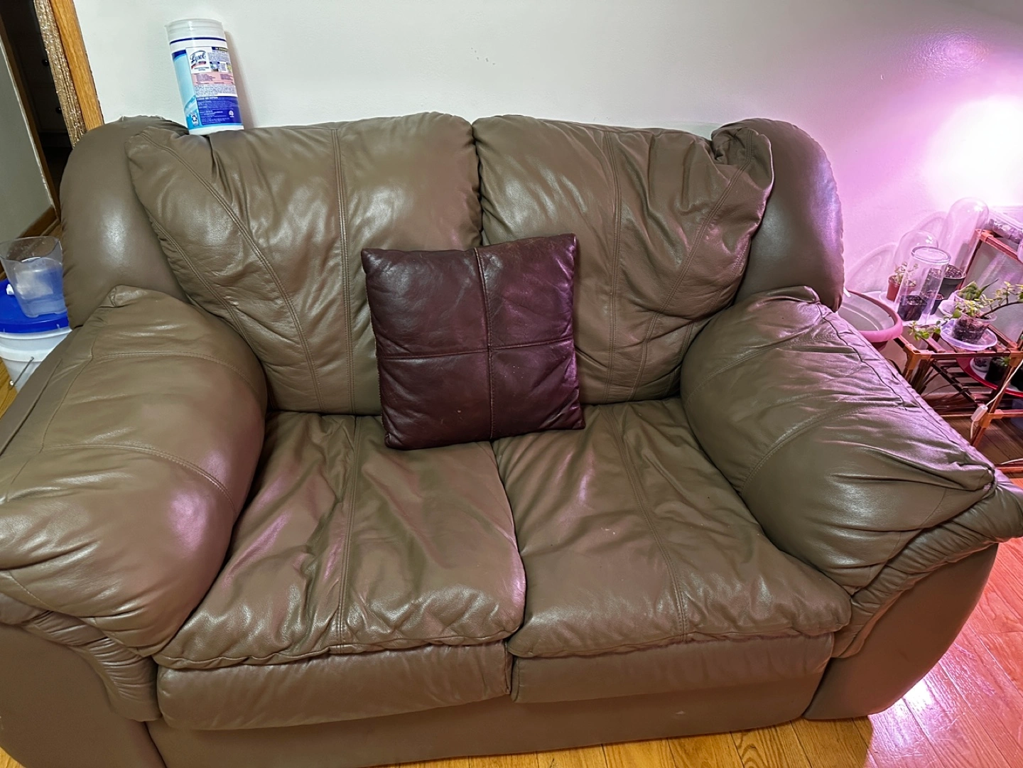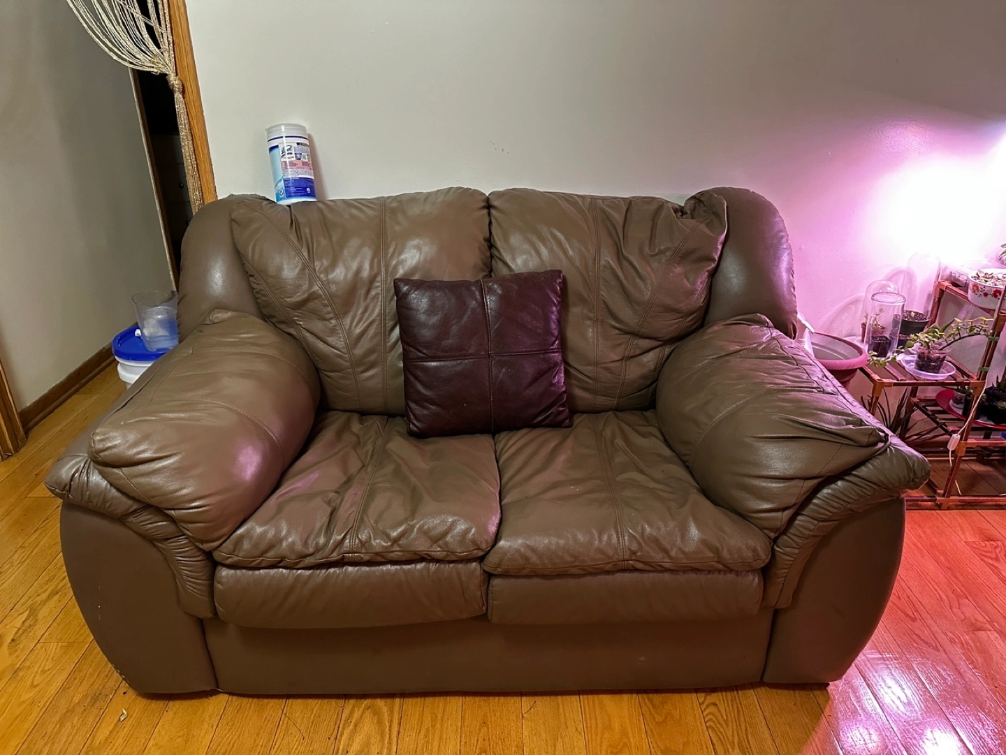 Brown leather loveseat with minor wear and tear. Includes three throw pillow.