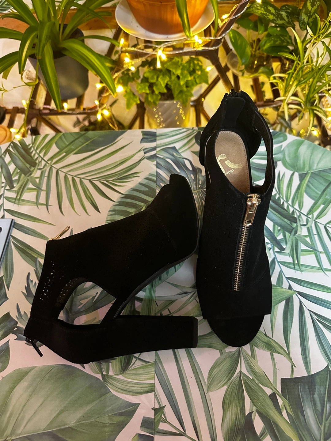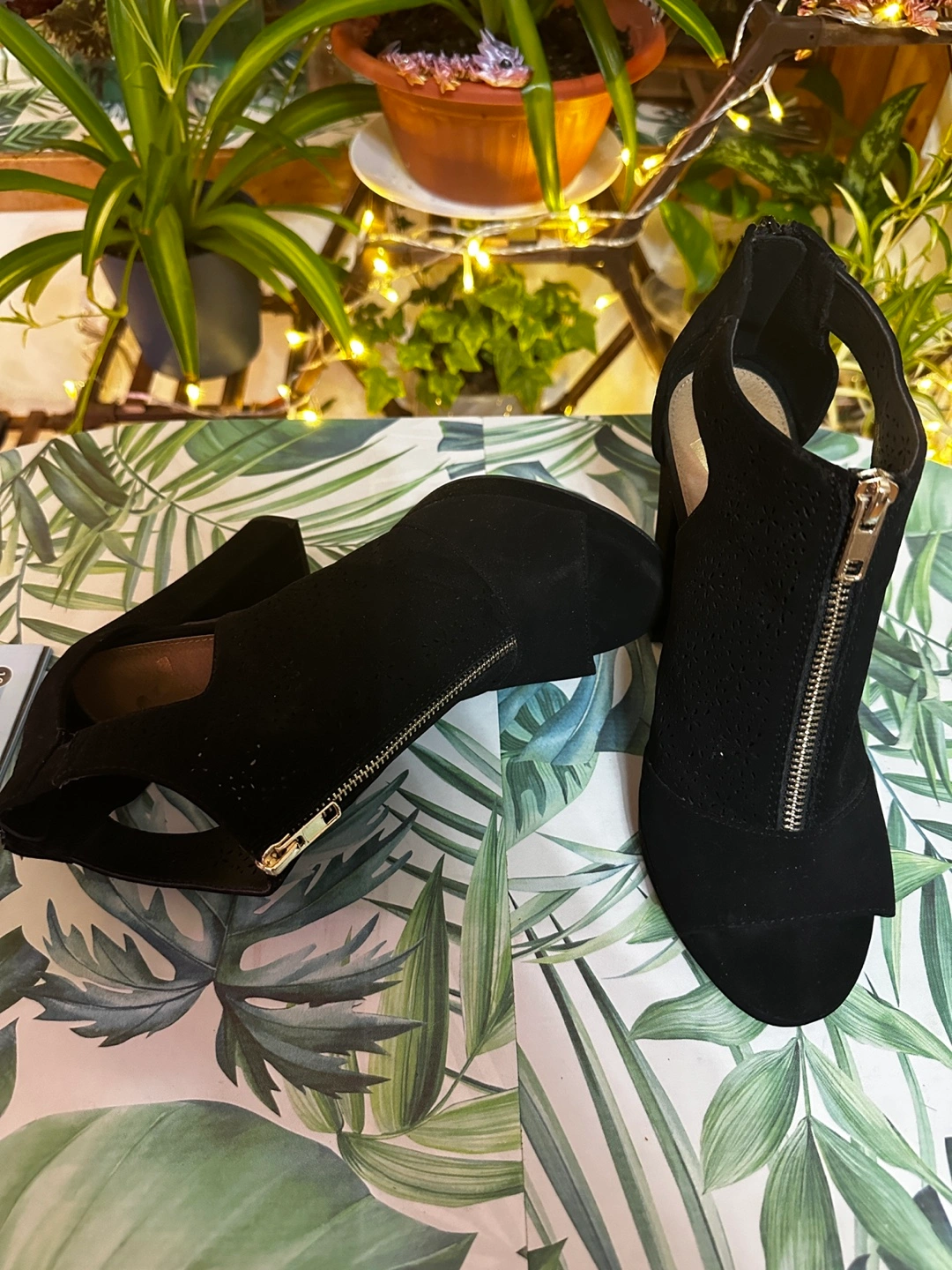 Black suede heels with gold zipper detail and cutout design. Open toe. Barely used