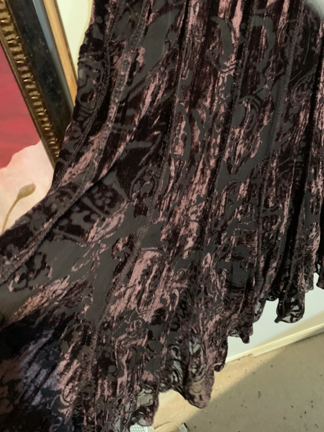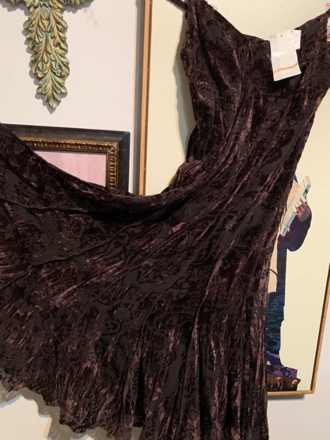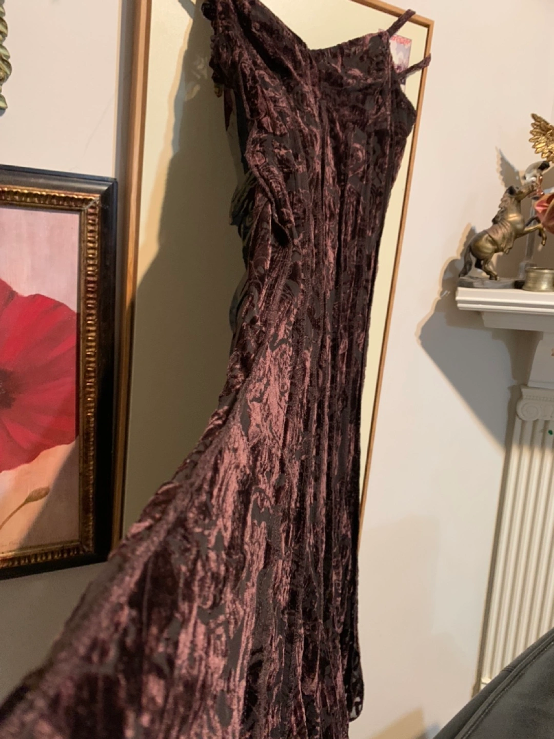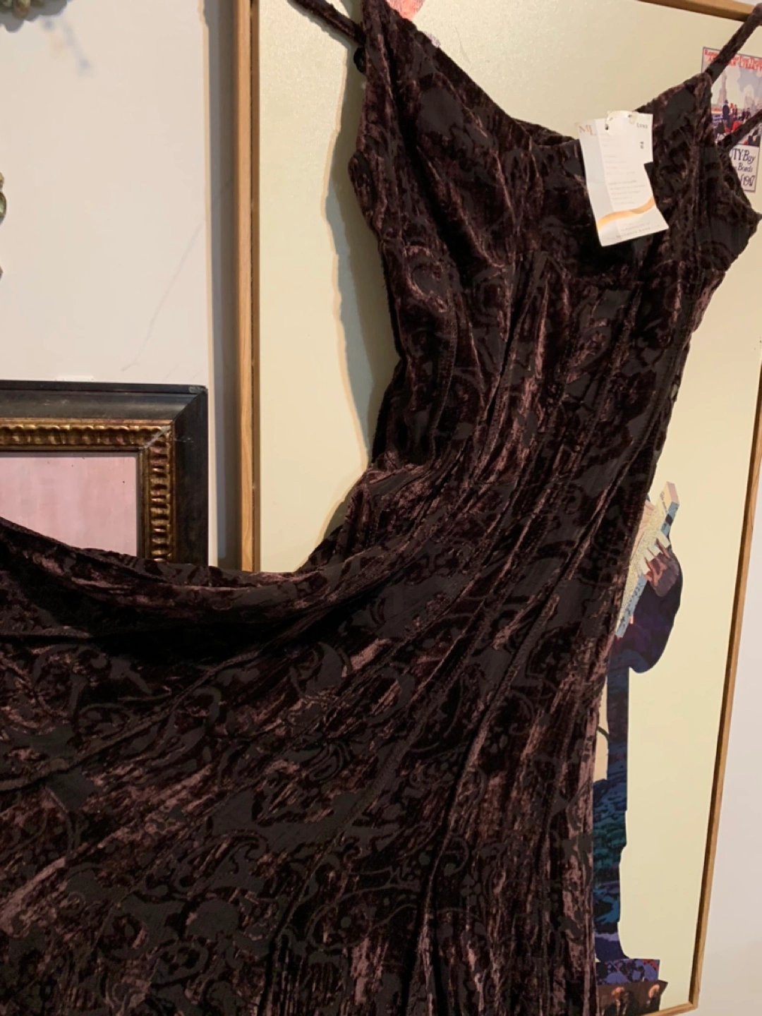 Chocholate brown designer silky velvet dress with a floral design. Sleeveless with spaghetti straps. Has a loose fit and a flowing skirt. Stretchy material.Lined With tags / below knees : 10cm : not long β πΉ