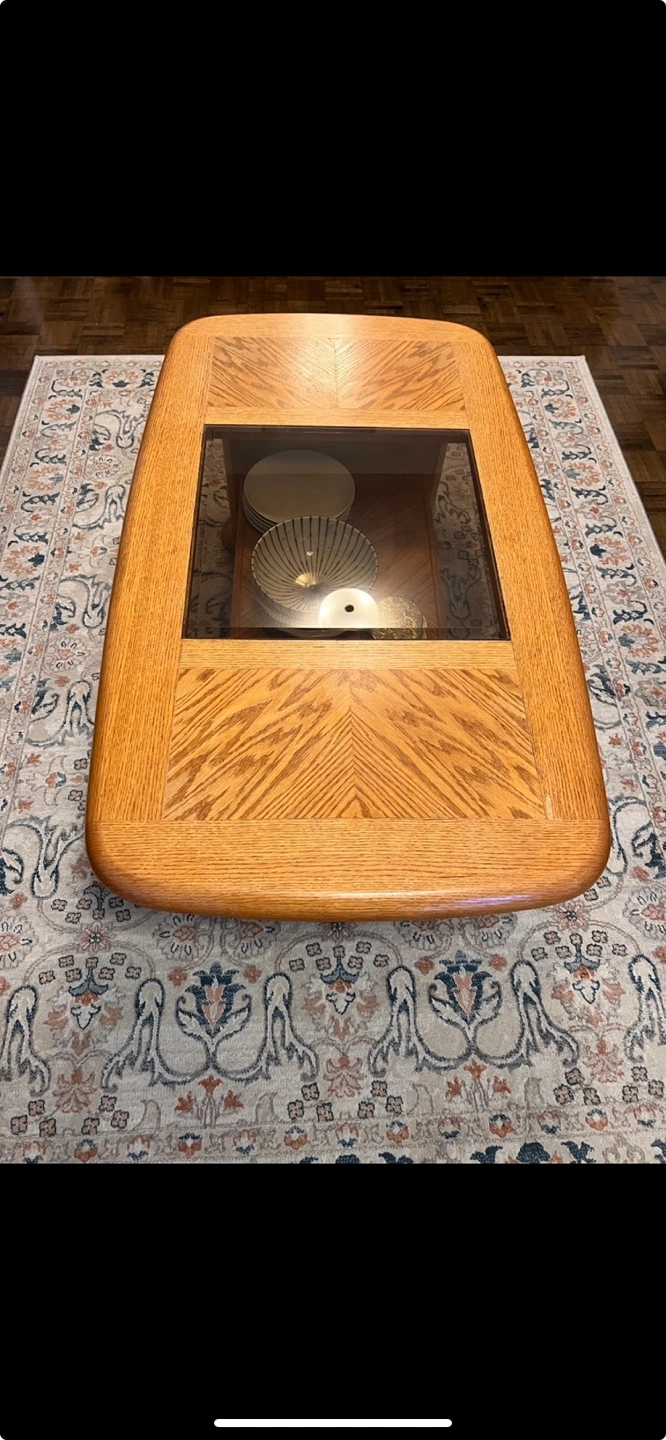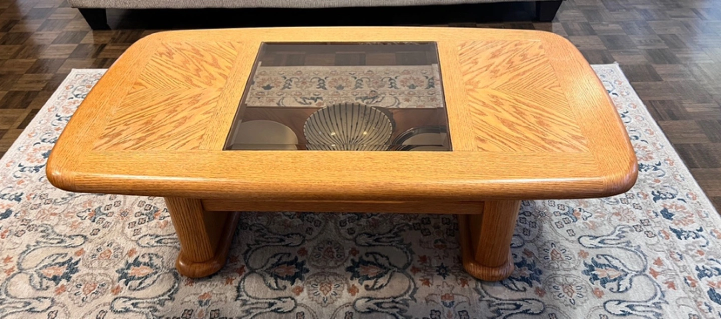 Solid wood coffee table with a glass top. Features a storage shelf.