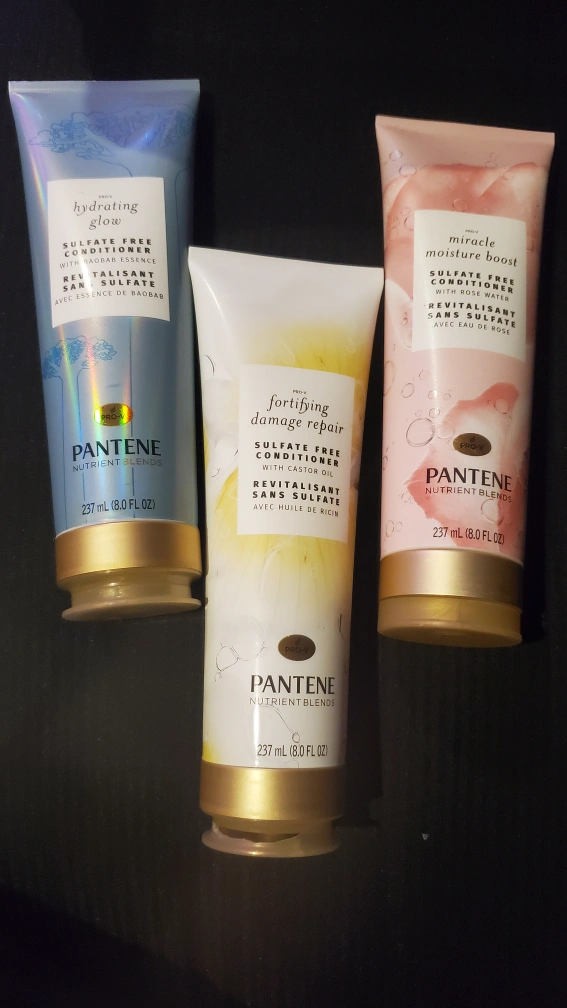 Three bottles of Pantene conditioner, each 237 ml. Flavours include hydrating glow with baobab essence, fortifying damage repair with castor oil, and miracle moisture boost with rose water.