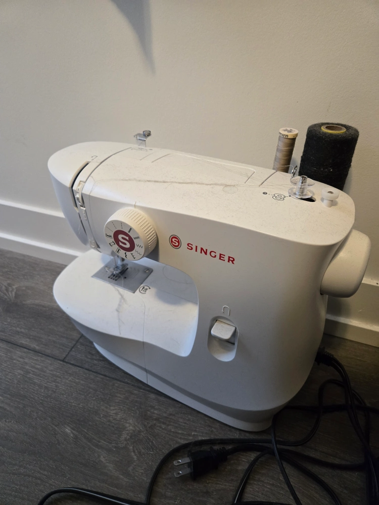 White sewing machine with a foot pedal. Includes power cord, thread, needle, and bobbin.