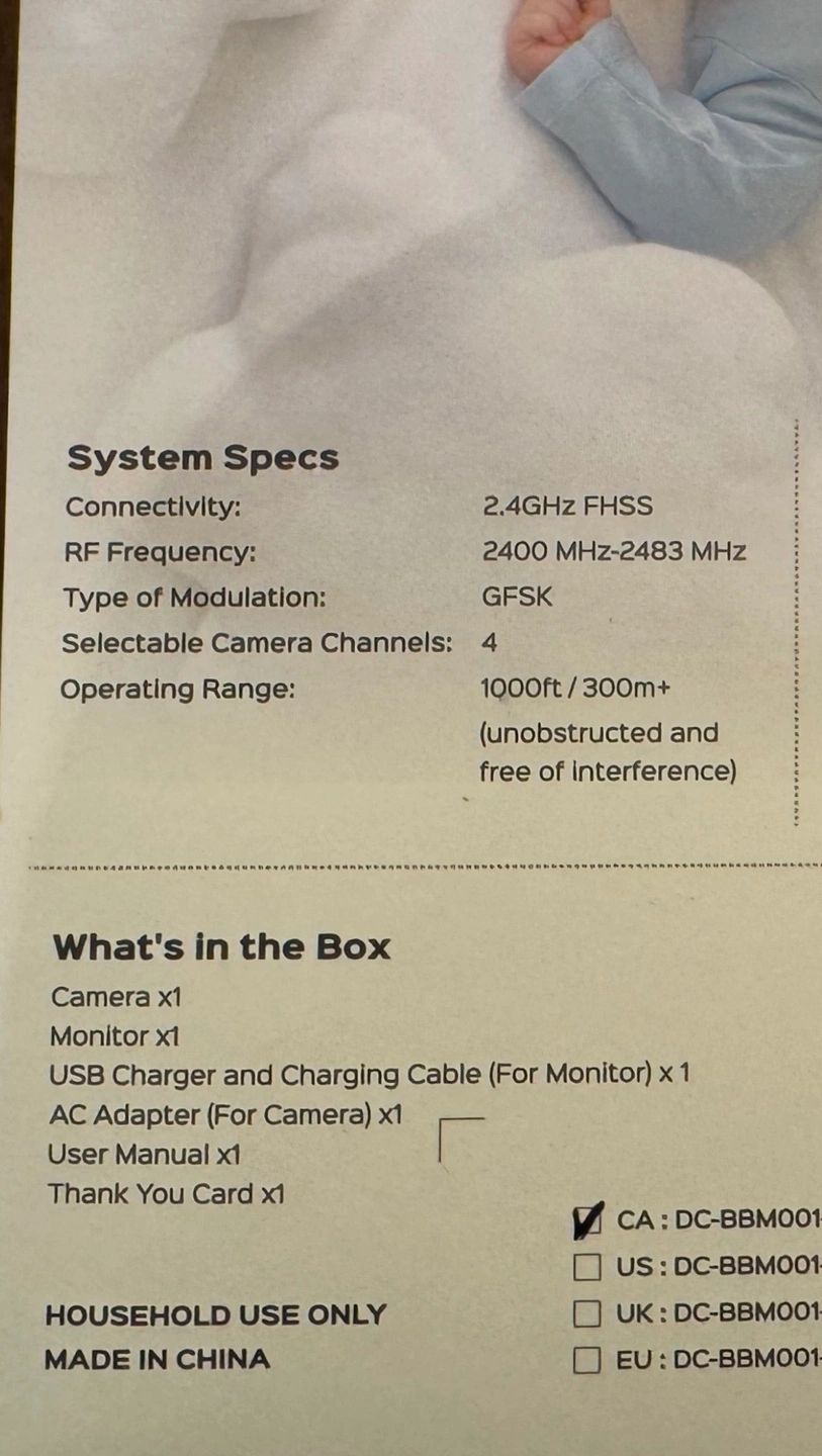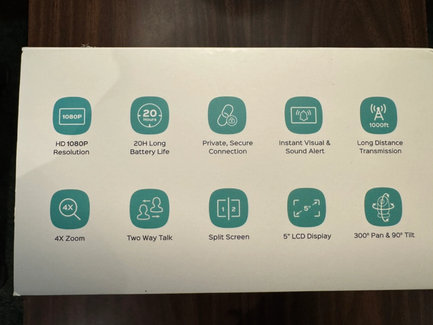 Split screen baby monitor. 5 inch LCD display. 1000 feet range. 2 way talk. 4x zoom. 300 degrees pan and 90 degrees tilt. 20 hours battery life.