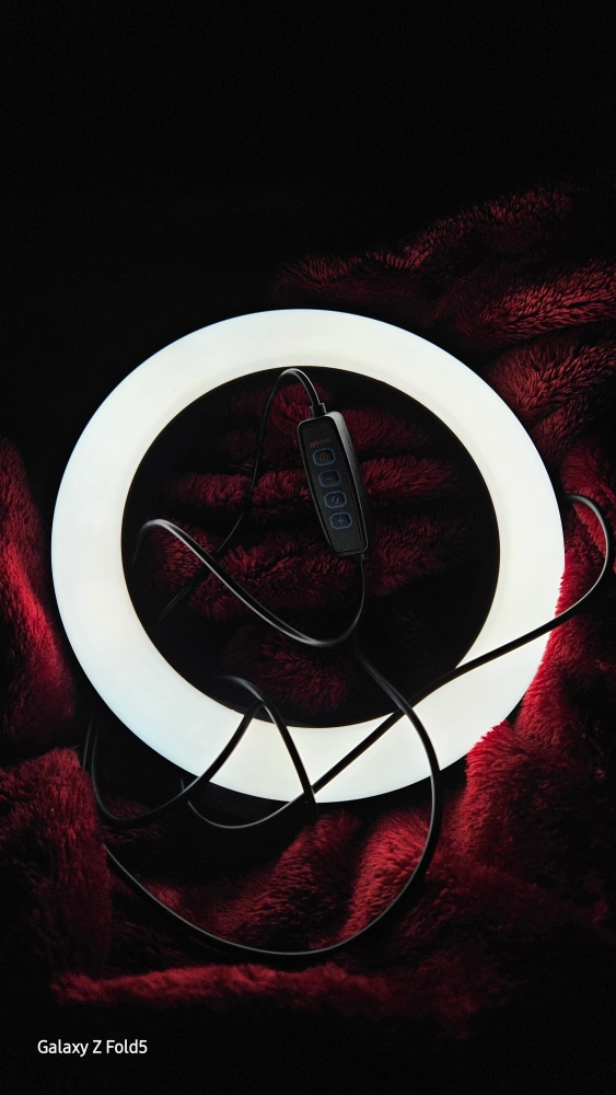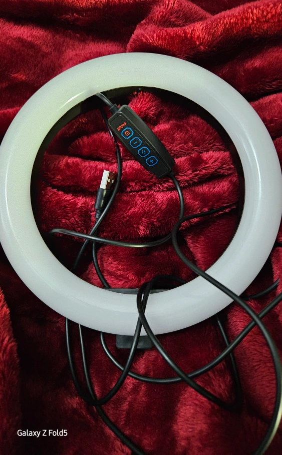 Ring light without a stand, USB powered, multiple brightness settings.