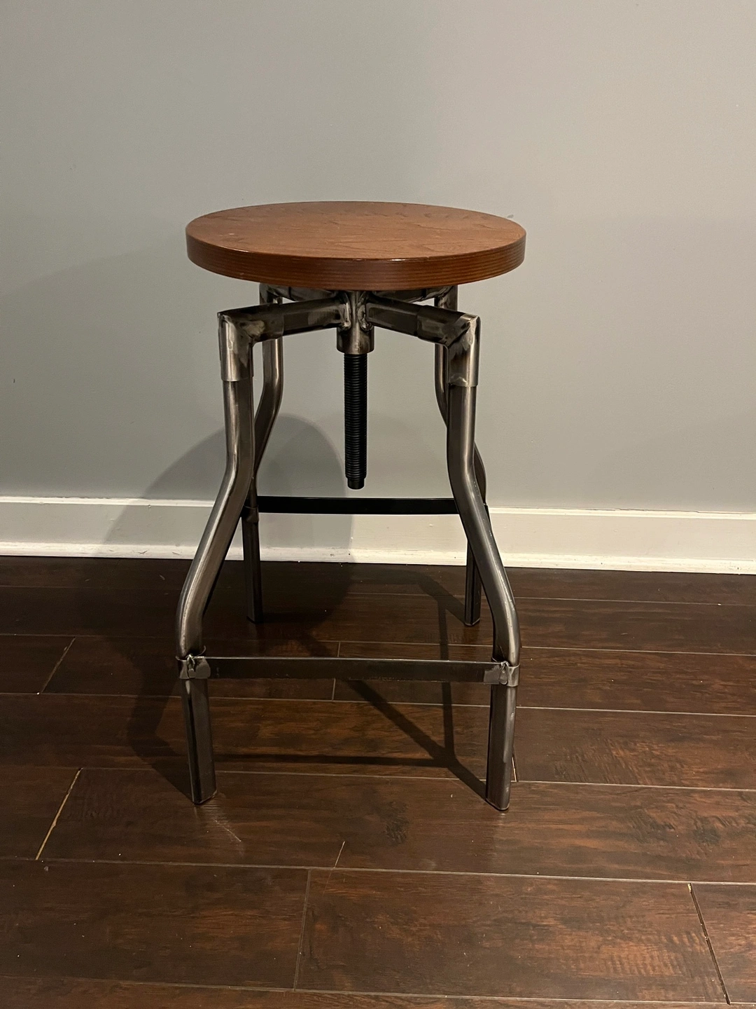 Adjustable stool with a wooden seat and metal frame. Features a screw mechanism for height adjustment.