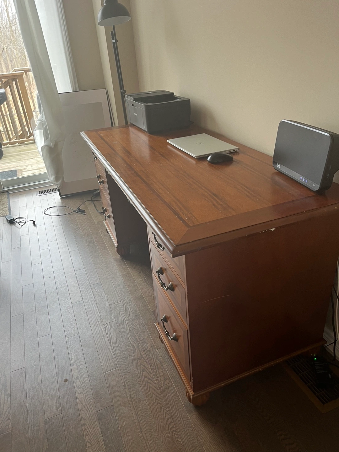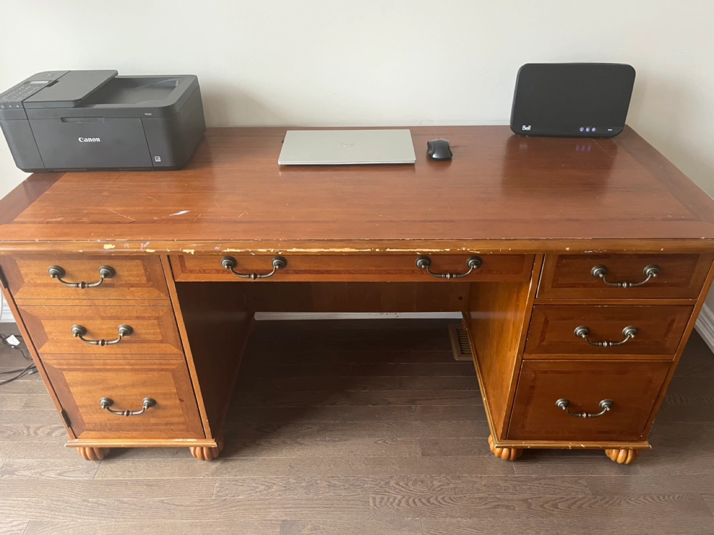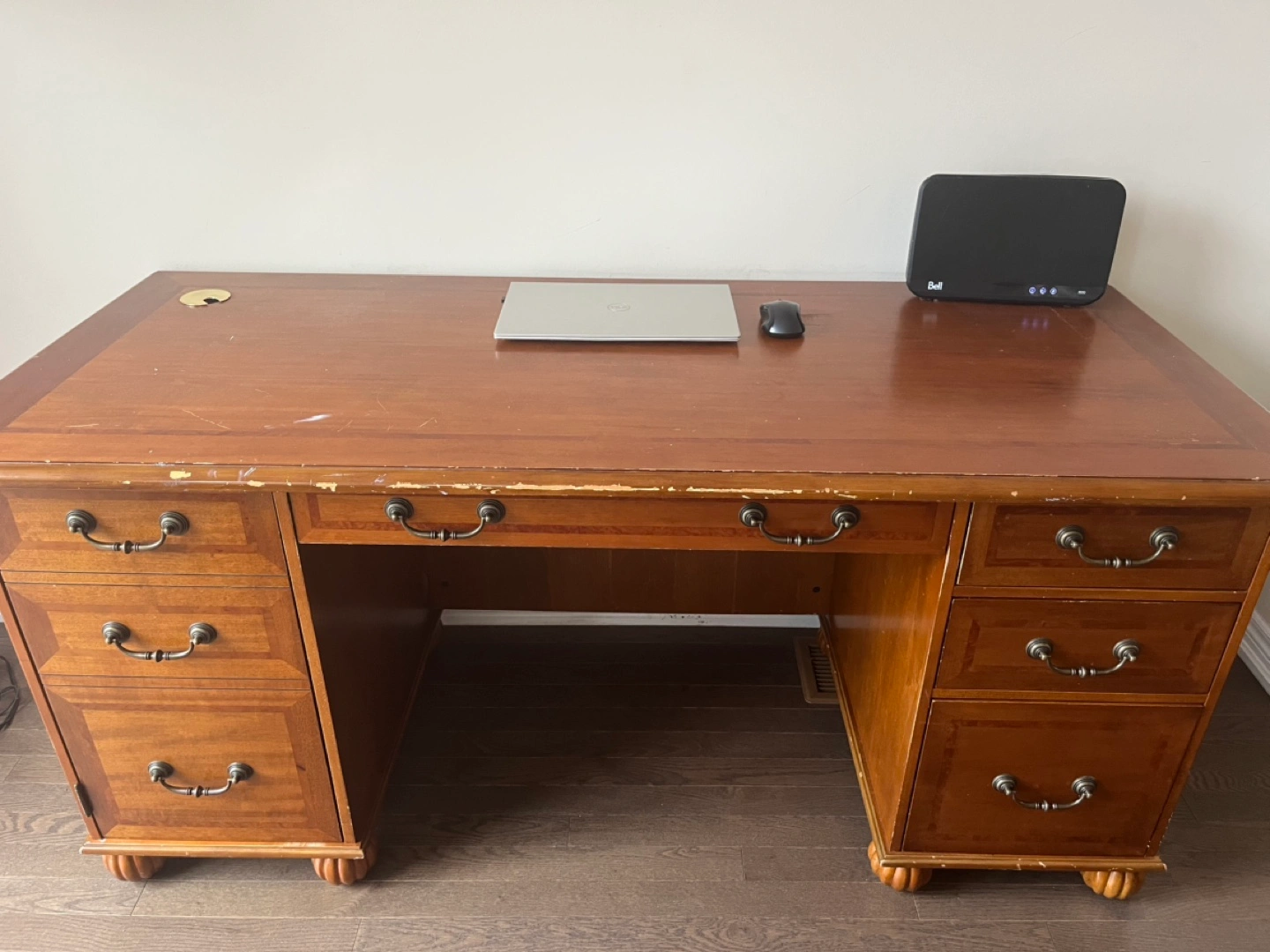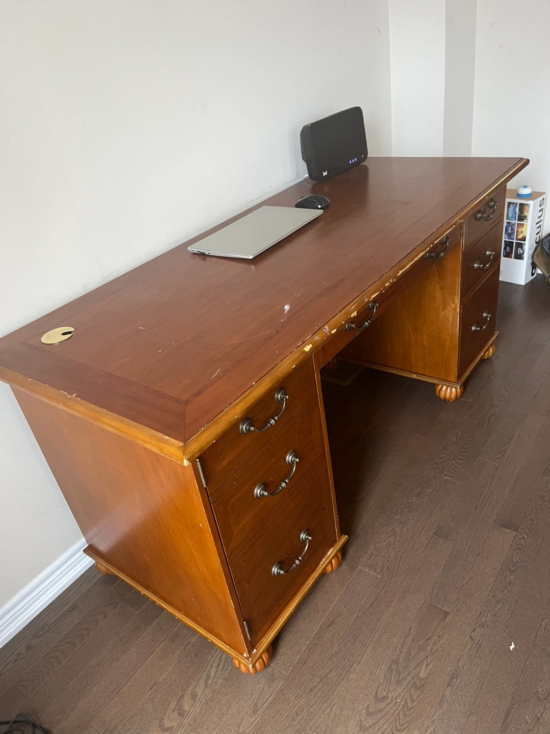 Large solid wooden desk with six drawers and pull open storage. Some minor wear and tear. Classic piece perfect for passion up cycle project.