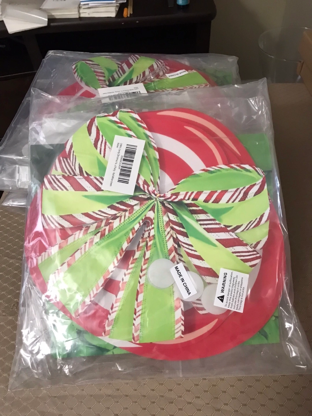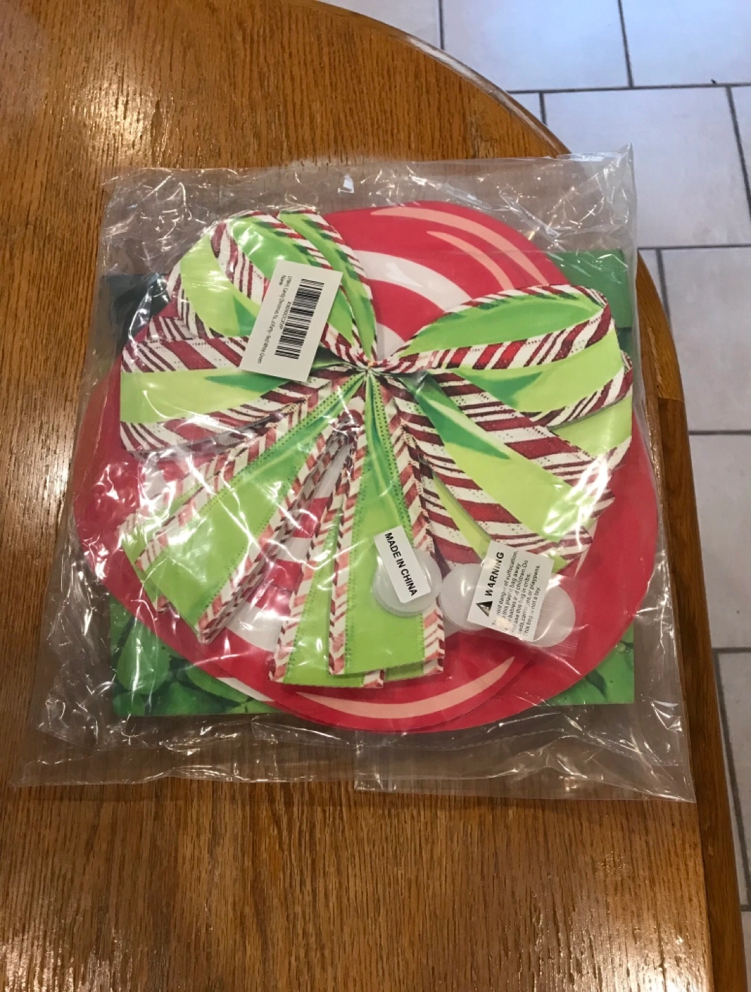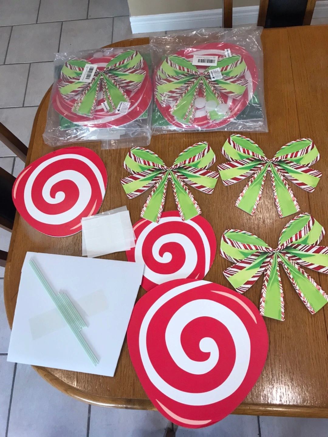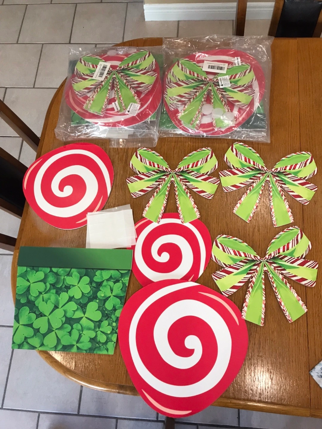 Set of three candy cane and bow yard decorations. Includes all pieces needed to assemble the decorations.