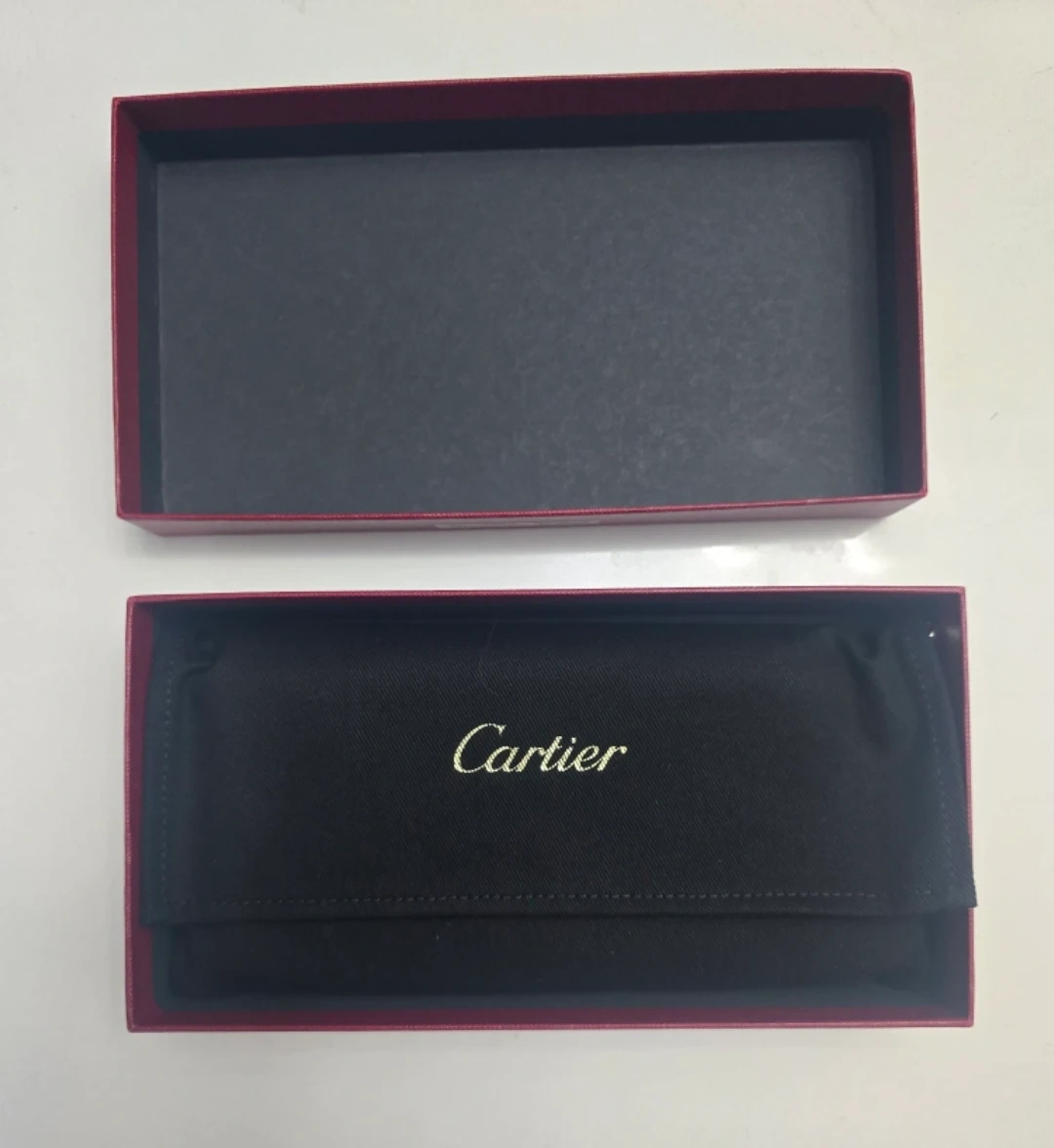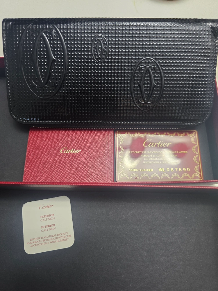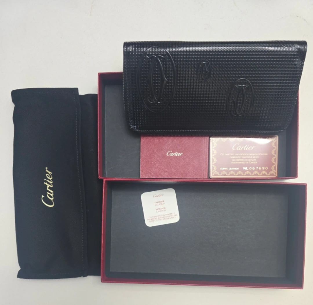 Black leather wallet, Cartier branding. Comes with box and dust bag, and authentic card.