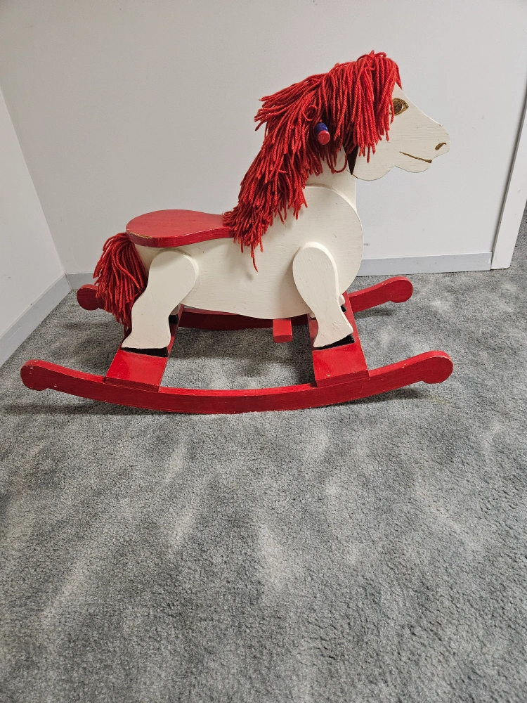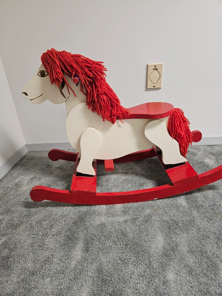 Wooden rocking horse. White horse with red mane and tail. Red rockers. Excellent condition. Ideal for ages 1 - 4 yrs. $20. obo. Ph. 204-612-7831