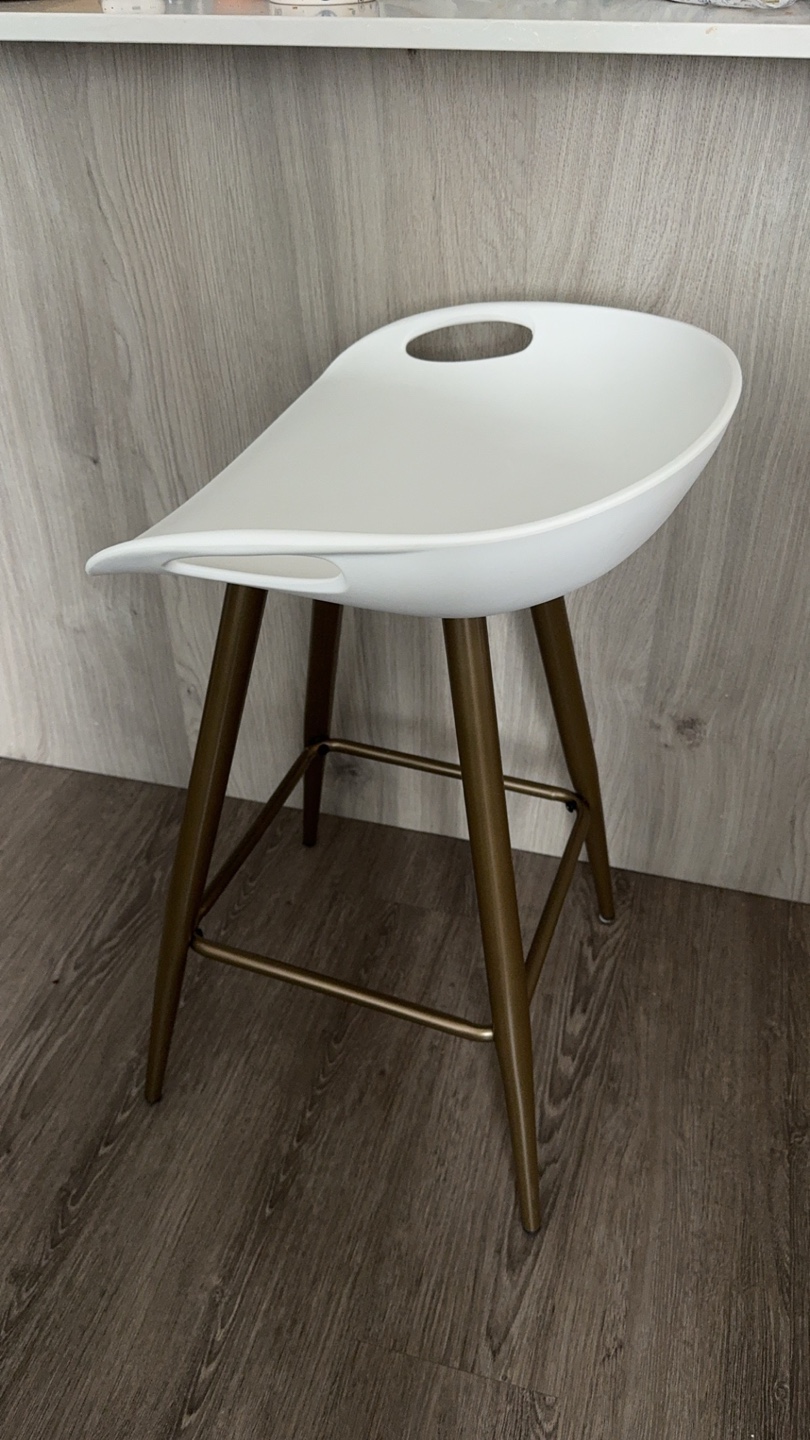 White counter stool with gold legs. The seat is white plastic and the legs are metal. The stool is in good condition. 60 for one or 100 for both