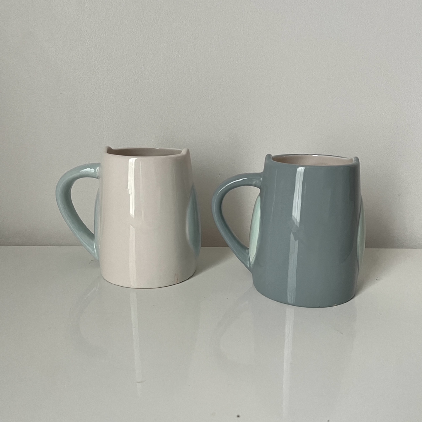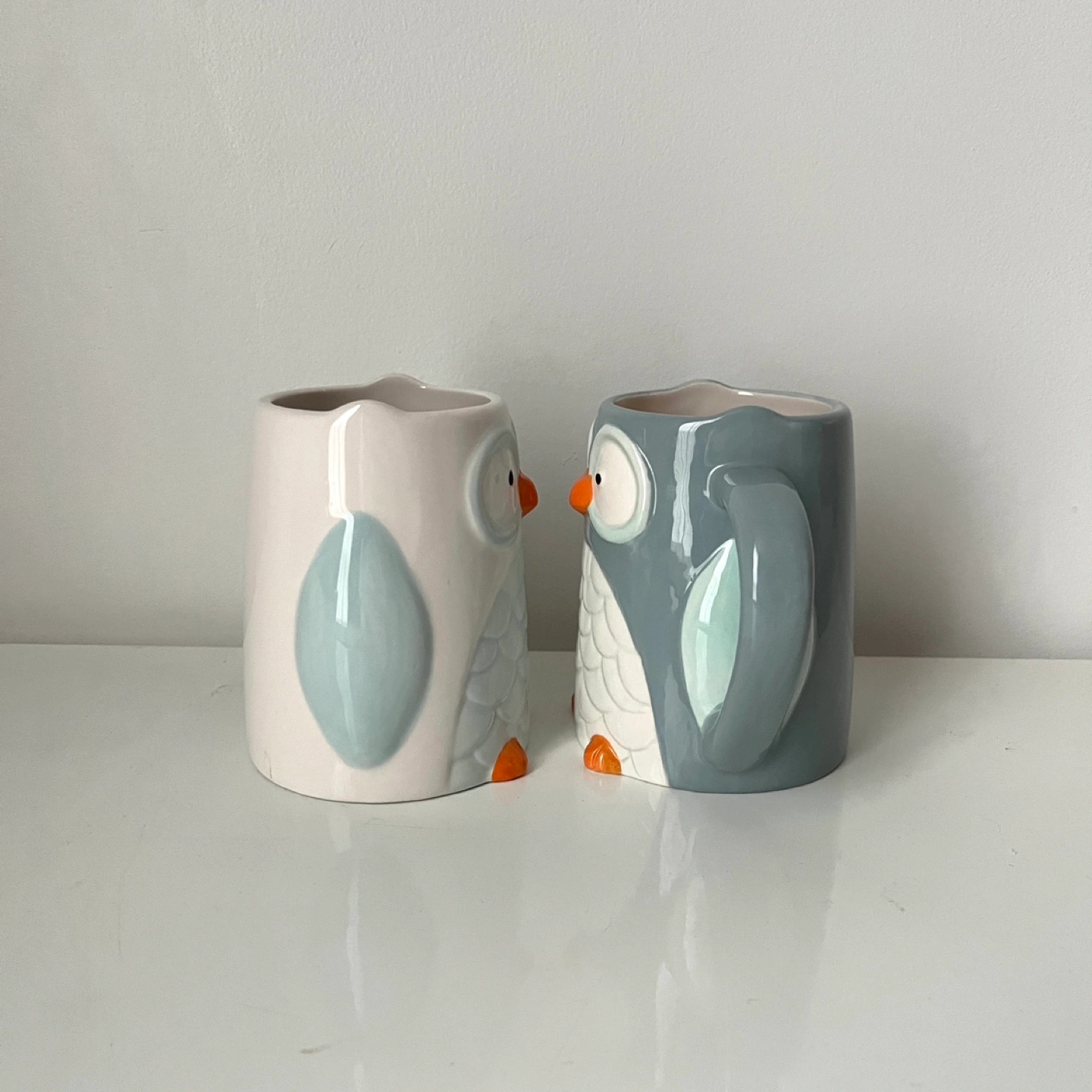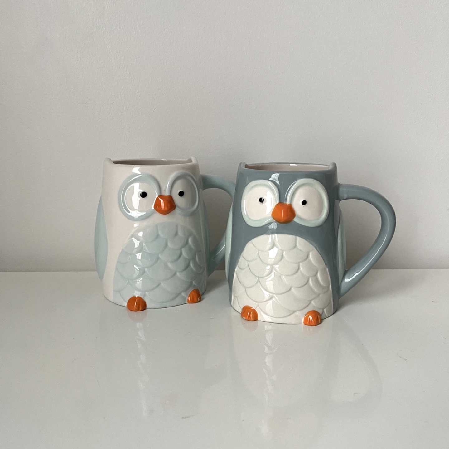 Set of 2 owl mugs, one white and one blue grey.