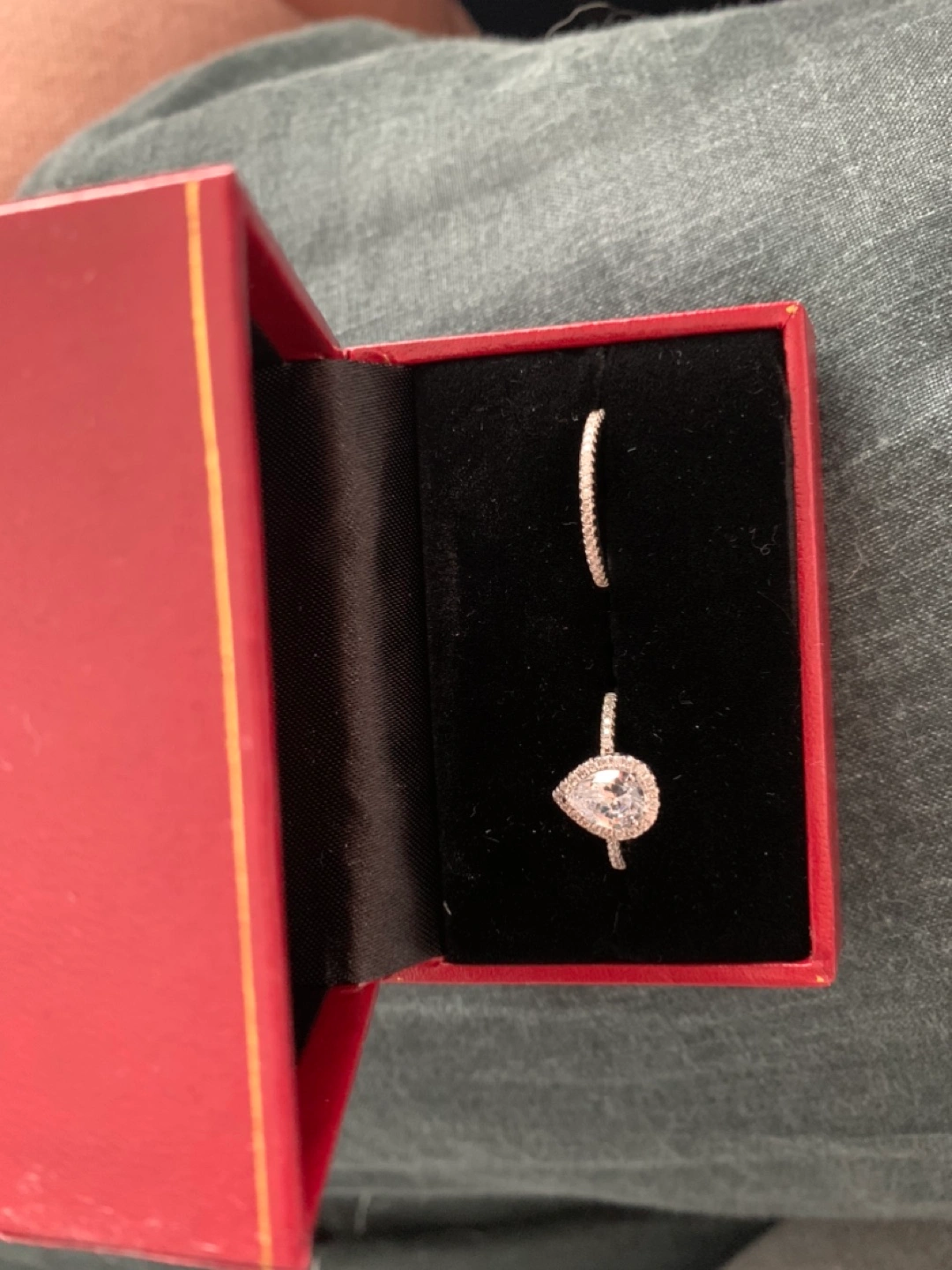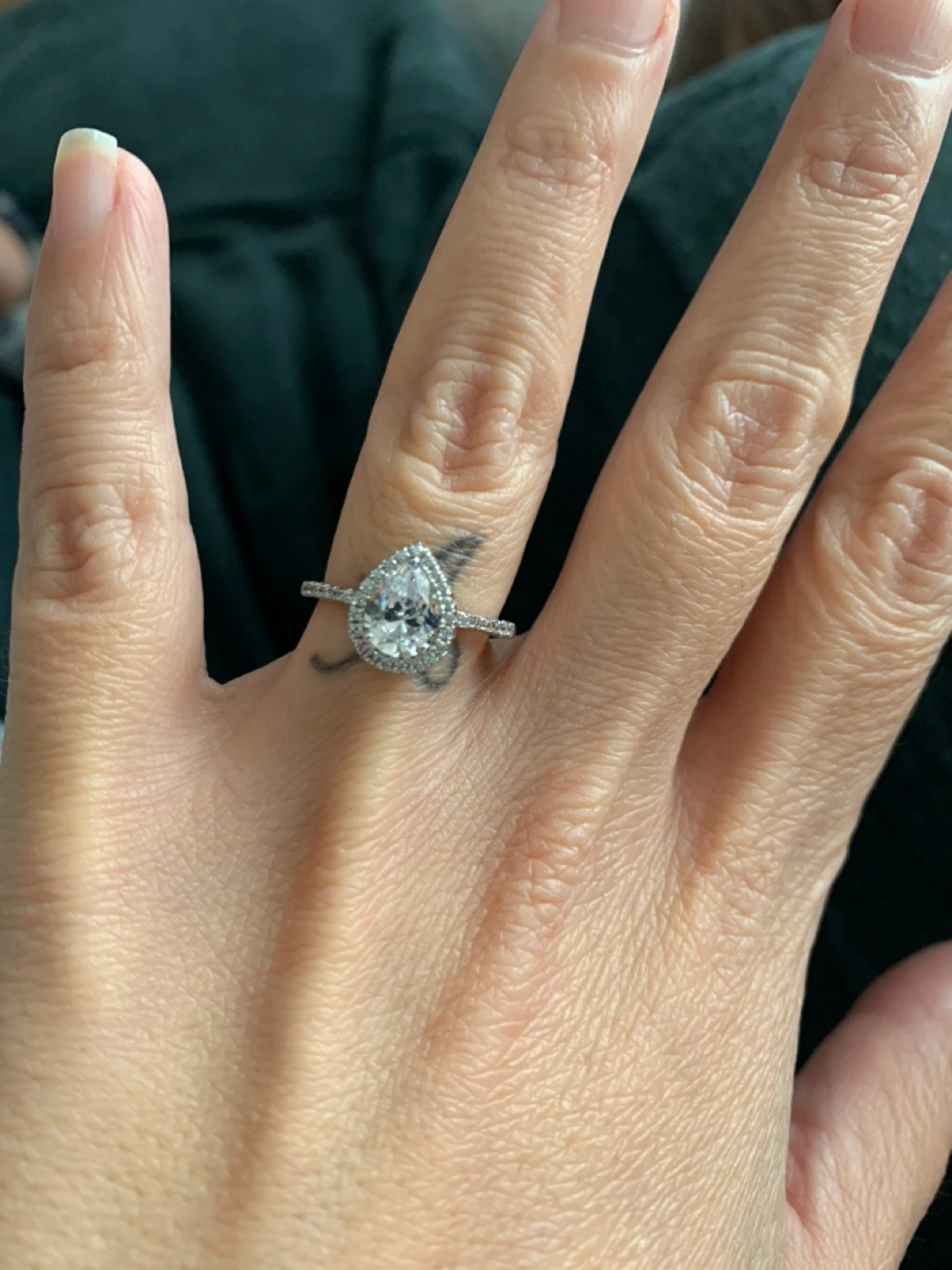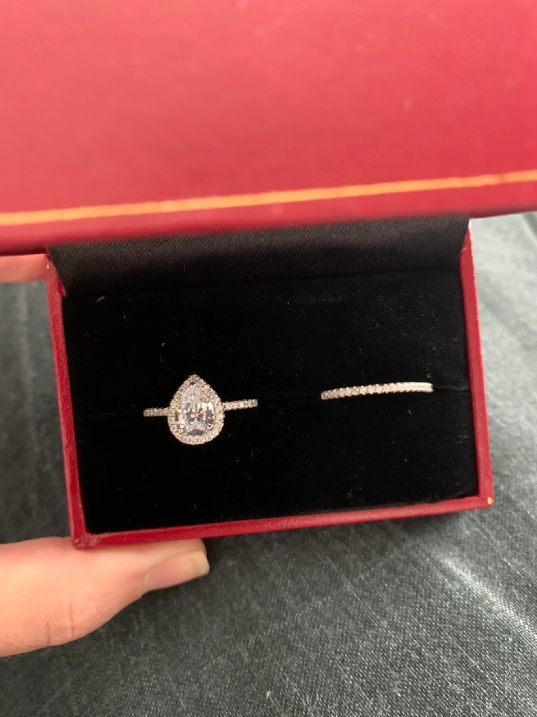 Pear shaped engagement ring with a matching band. Comes in original box. Lab Simulated Diamond 925 Band.