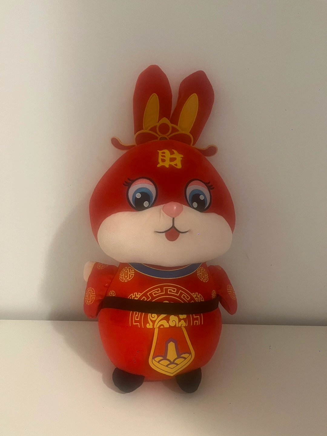 Red plush bunny with a Chinese design. It is wearing a traditional outfit with a black belt. The bunny is about 10 inches tall.