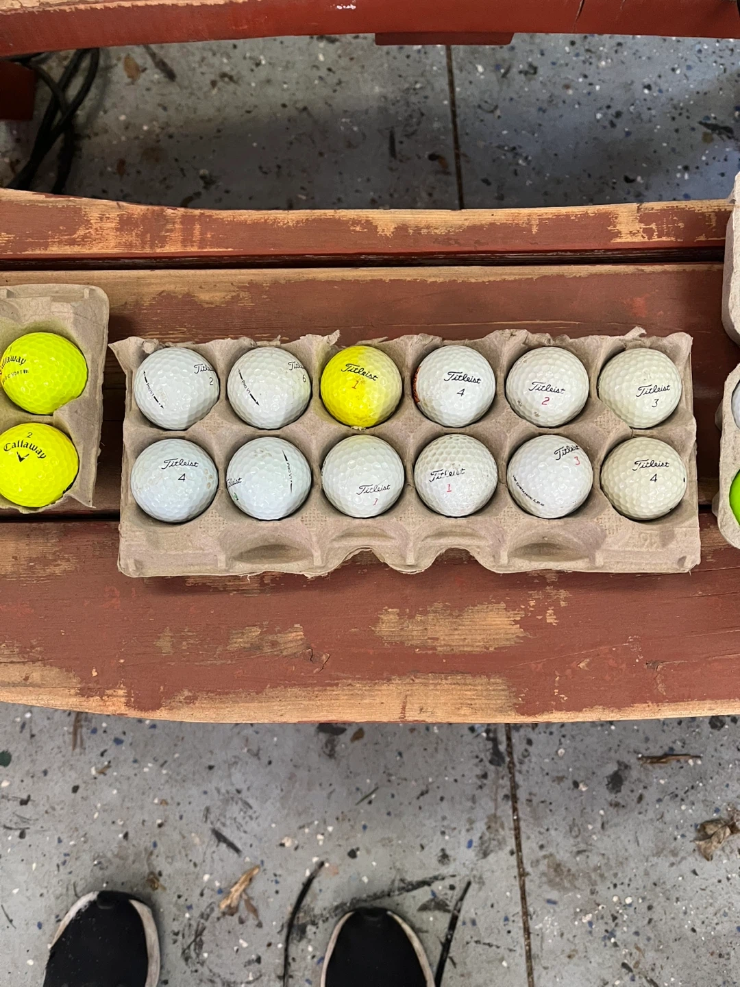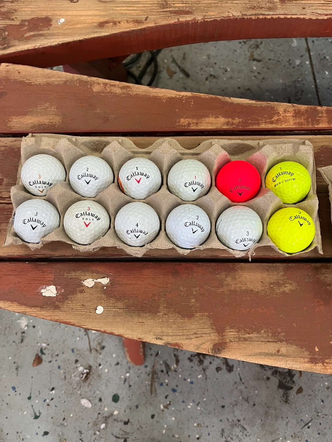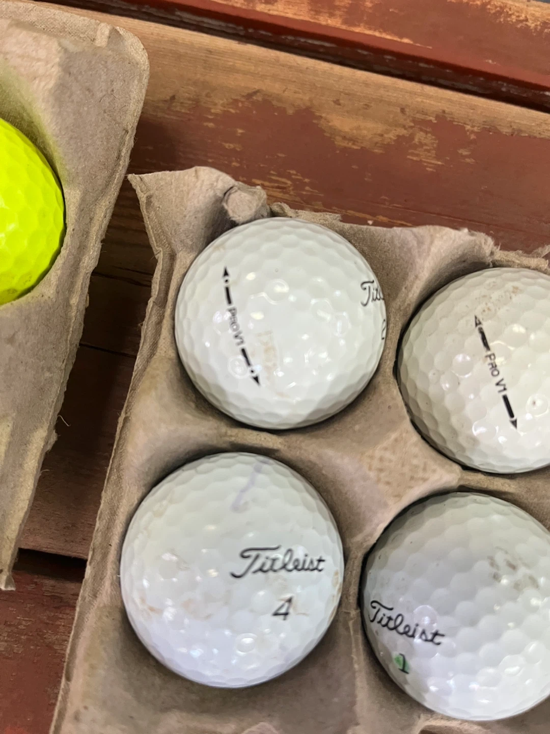 A collection of assorted golf balls. Includes Titleist Pro V1 models, Callaway, Wilson Staff, Srixon, Pinnacle, Dunlop, and Maxfli balls. Some are yellow, one is red, and the rest are white. These are standard golf ball size. Lots others for sale as well! Price per dozen. 10.00 for better balls, $5.00 for practice balls.