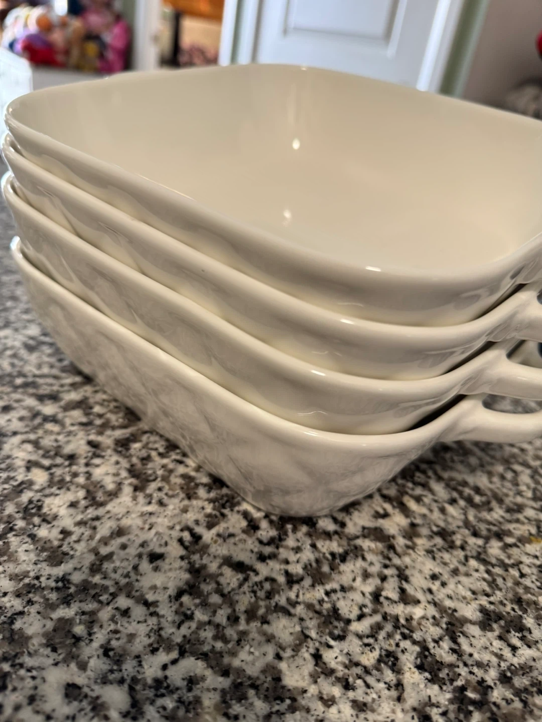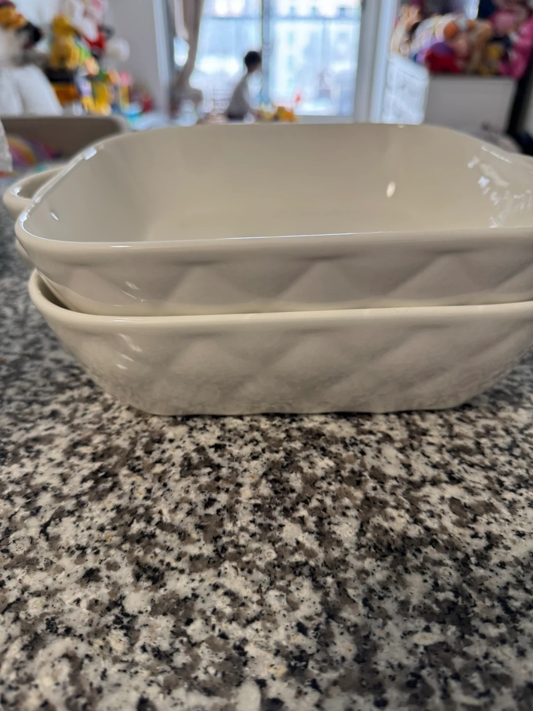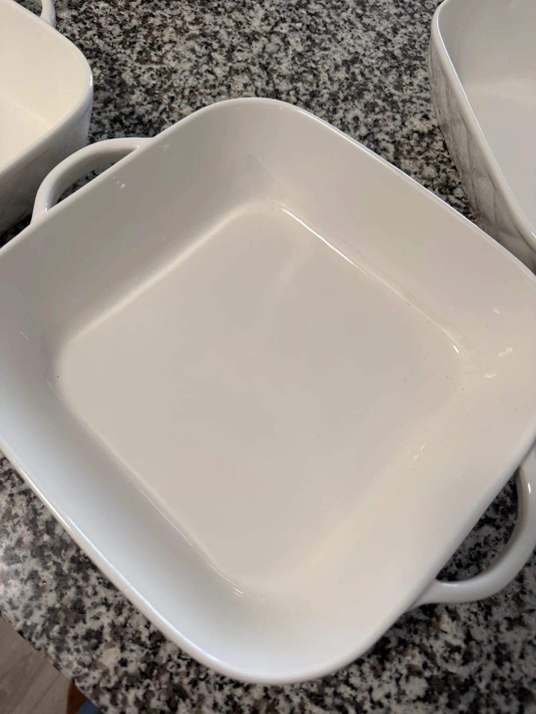 Set of white ceramic square baking dishes with handles. These are perfect for casseroles, baking, and serving. They're durable and easy to clean.