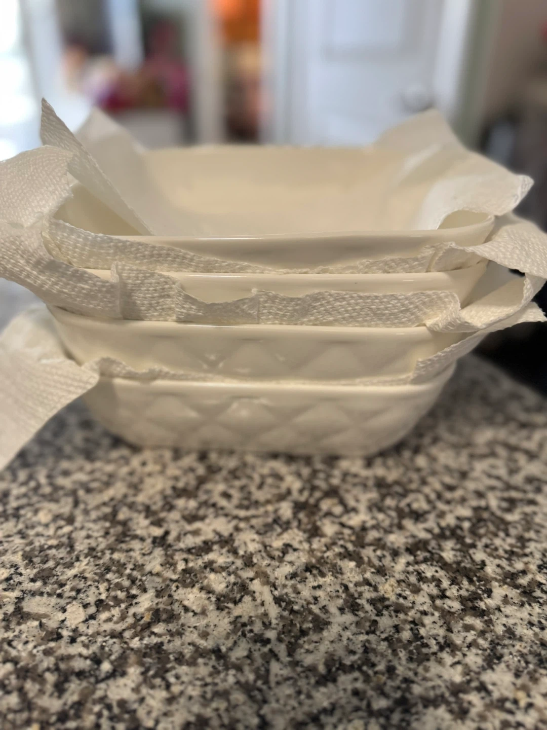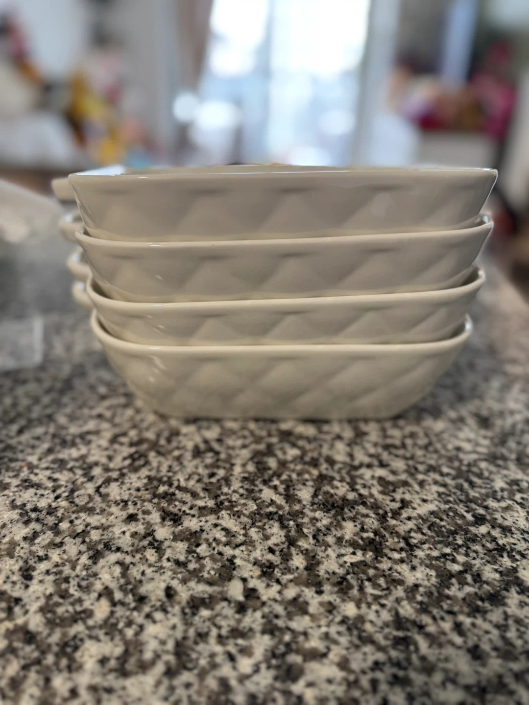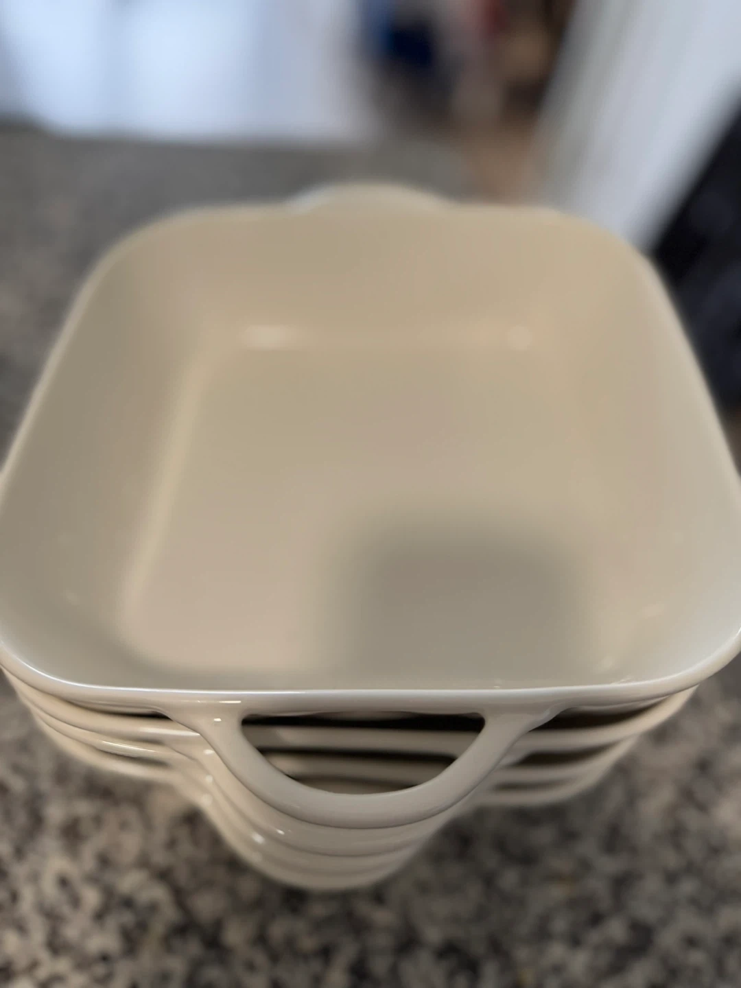 Set of white ceramic square baking dishes with handles. These are perfect for casseroles, baking, and serving. They're durable and easy to clean.