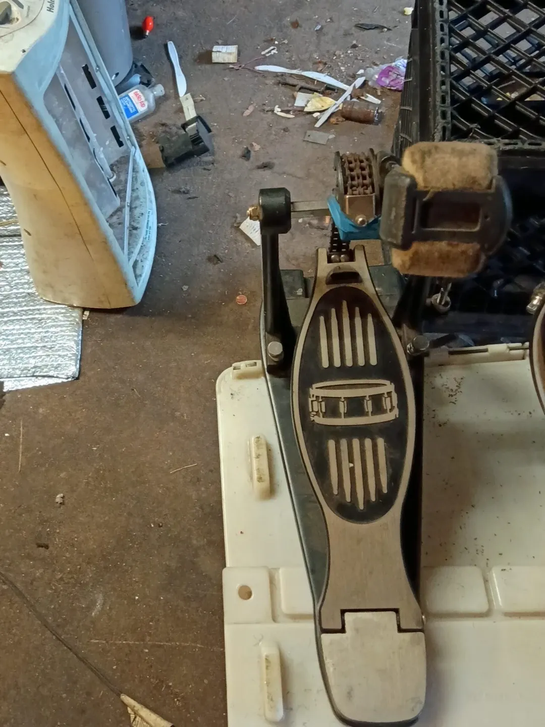 This is a bass drum pedal. It features a metal footplate with a drum graphic. The pedal operates via a chain drive.