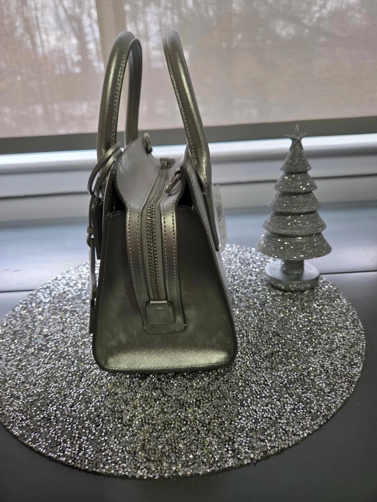 This NWT Coach Andrea Carryall handbag is a stylish accessory featuring a glittery silver finish and a star charm, perfect for adding a touch of sparkle to any outfit. It's in excellent condition, ready to elevate your wardrobe!
