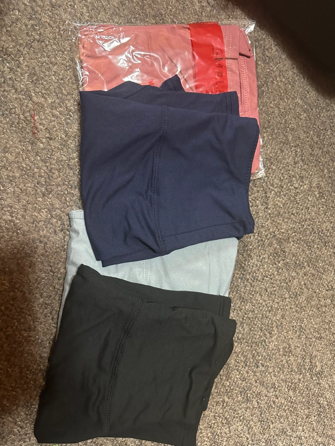 Four pairs of high waisted workout shorts. Includes colours: black, navy, grey and pink. Stretchable and comfortable material Never worn, still in packaging.
