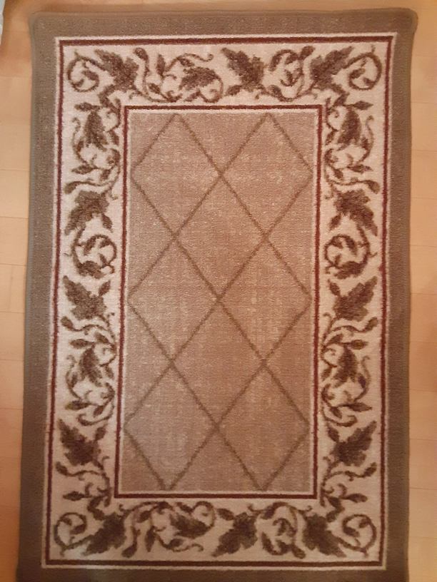 Beige area rug with diamond pattern and floral border. Suitable for a hallway or entryway.