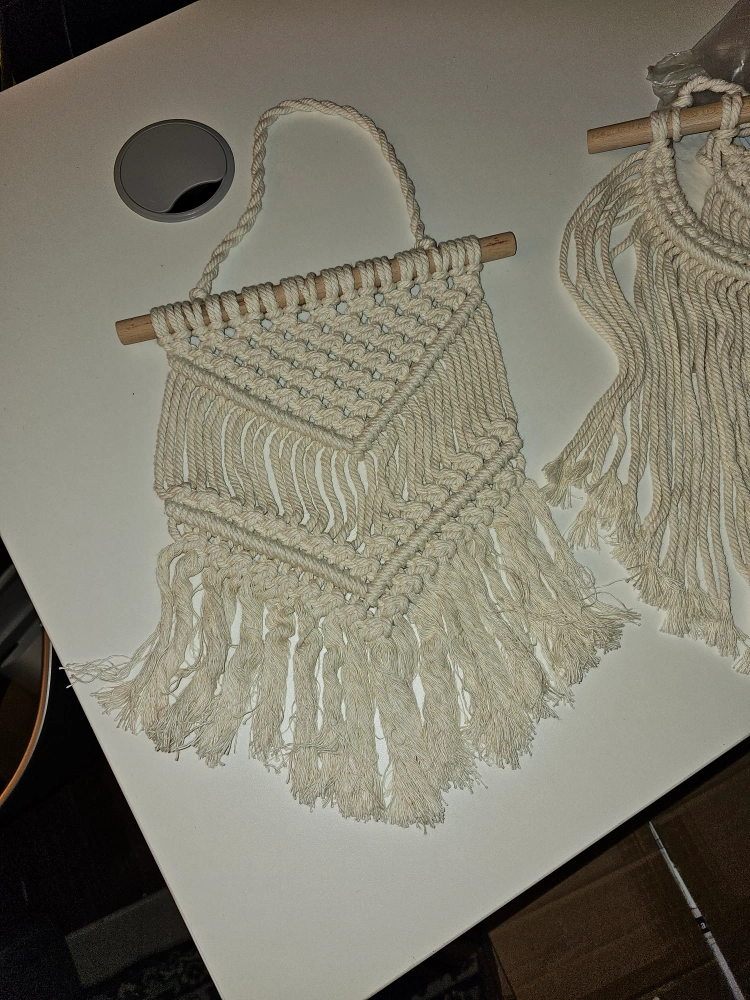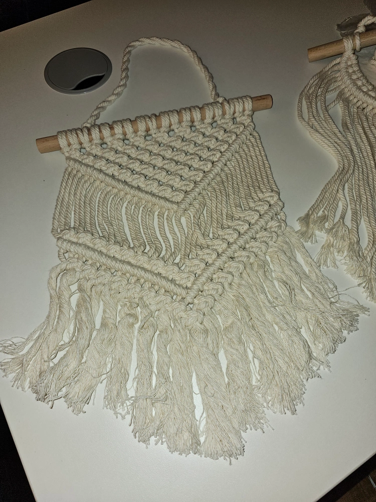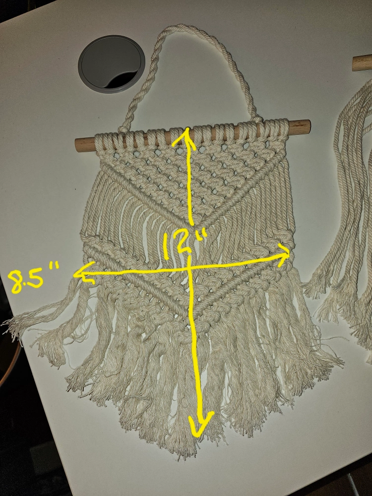 White macrame wall hanging with a wooden dowel. Has a loop for hanging. Measures approximately 12 inches tall and 8.5 inches wide.